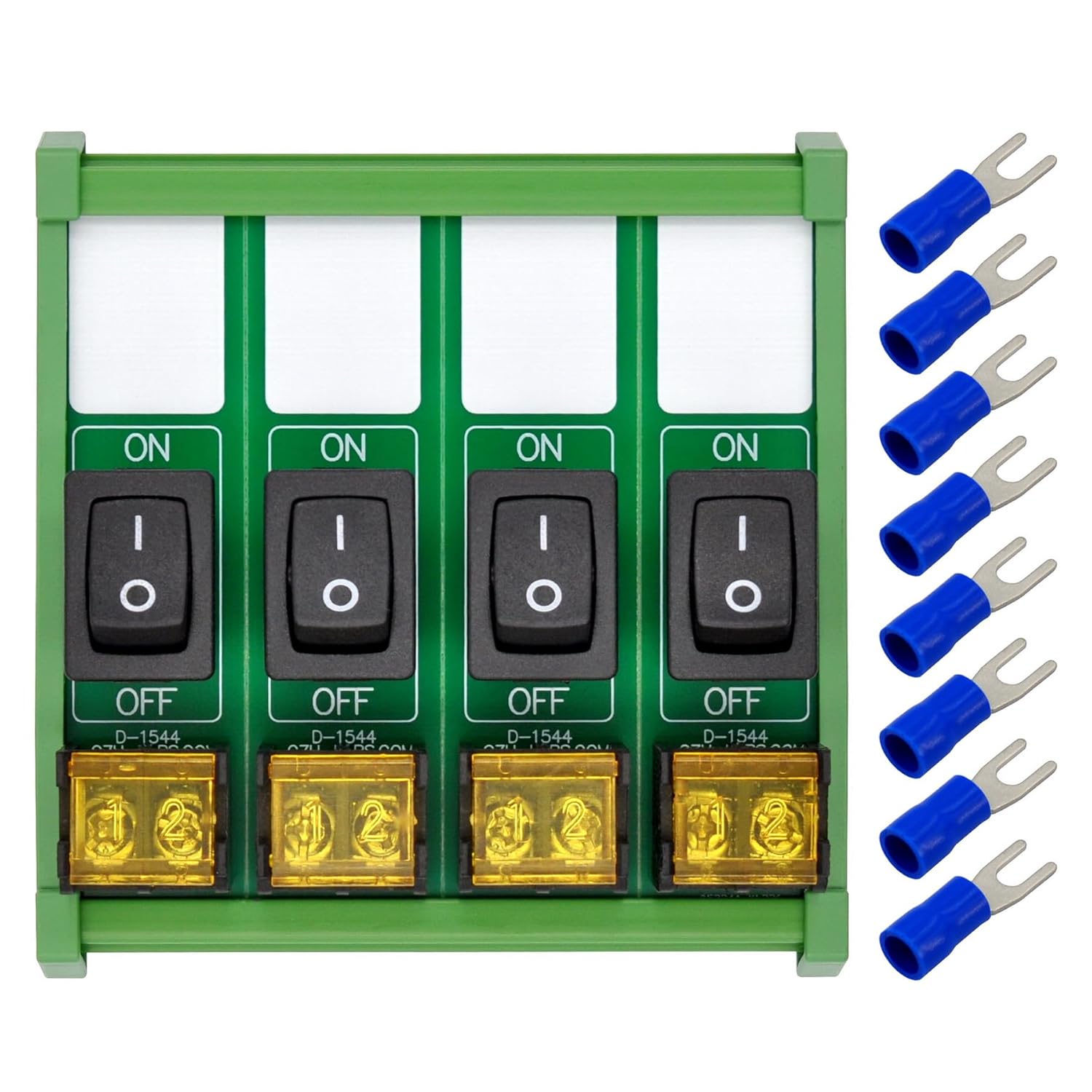 1, Rated voltage: 250VAC or 50VDC. Rated current 10 Amp (for per channel). 2, ON-OFF rocker switch. 3, Terminals pitch 7.62mm/0.3", removable cover, Metric M3 screw. With vinyl-insulated spade connectors, can support cable 16 - 14AWG / conductor cross section 1.5 - 2.5 square millimeters. 4, High quality fireproof nylon material DIN rail mount carrier, can support width 35mm 32mm 15mm rail. 5, UL CE certified fireproof nylon material housing carrier. UL 94-V0 certified FR-4 fiberglass PCB. CE CQC certified terminal blocks.