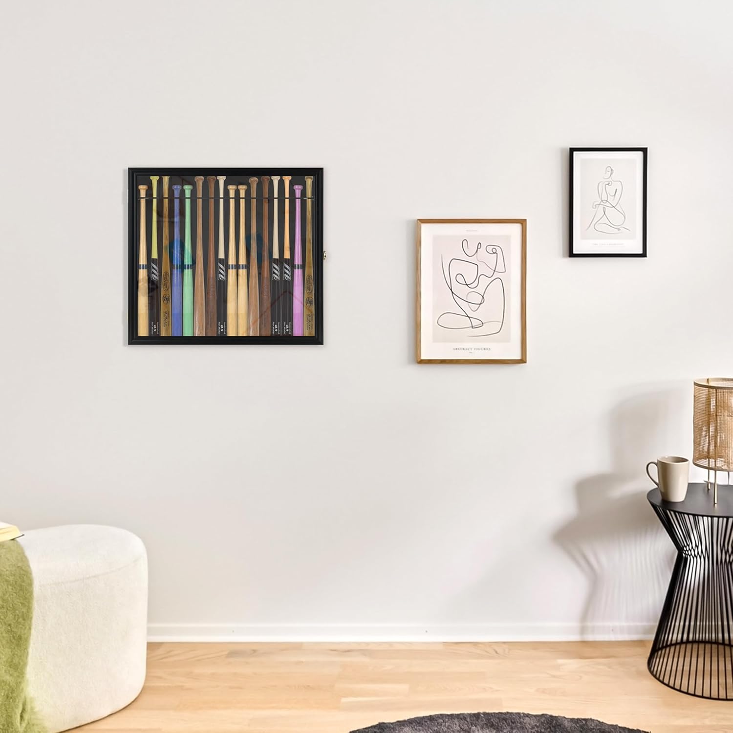 DisplayGifts guaranteed quality display case cabinet for 18” miniature baseball bat display. This furniture grade Mini 18” bat display case is of beautiful design and construction, very detailed and attractive, but also very affordable. Perfect way to display your mini bats collection. This case can only display mini 18” baseball bats. It has a built-in rope holder which allows you to attach the bats in place without falling. A smooth acid free felt fabric background creates a stunning background for your bats. Display case comes standard with a 98% UV Protection acrylic door, lockable latches with keys, and all hardware to mount the case to the wall. Comes fully assembled. (bats shown are not included). . Outside: 21.5" X 19.5H" X 2.5. Inside: 20.25"W X 18.5" X 1.75"D."H