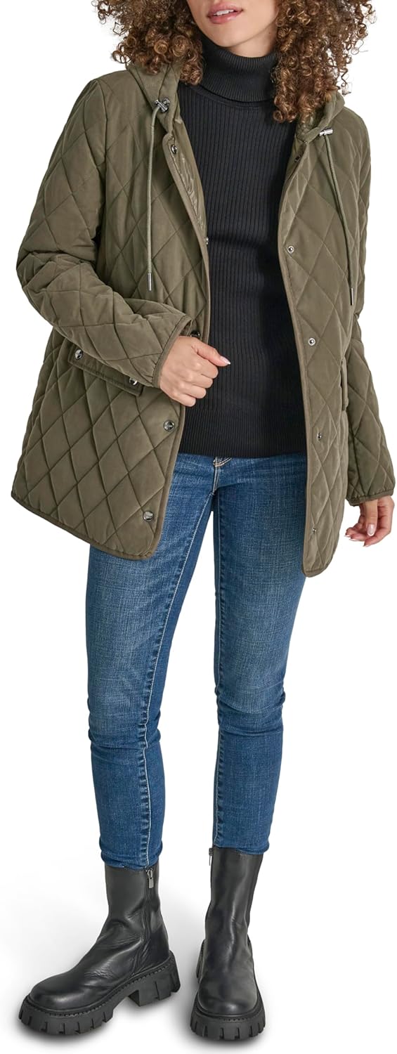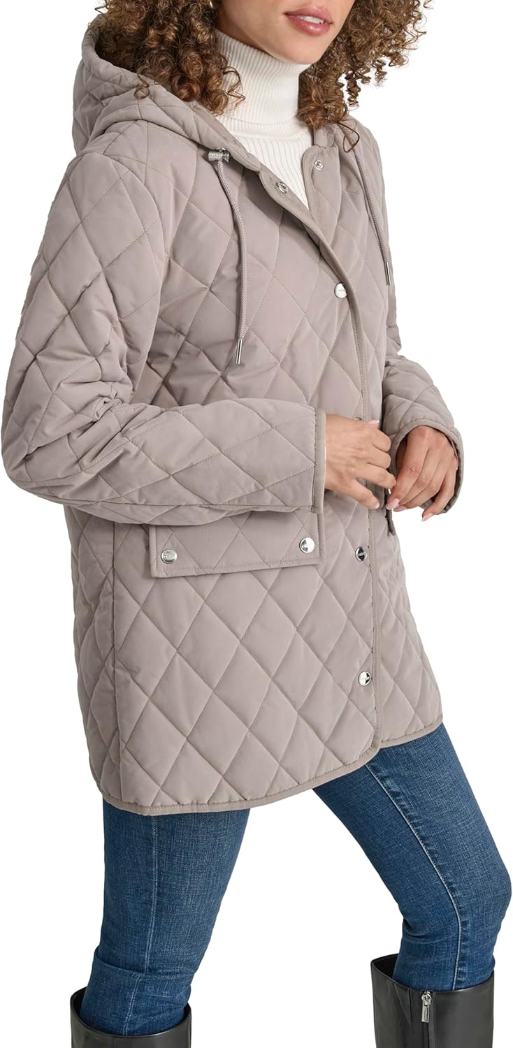 This DKNY Women's Outerwear is a Hooded Micro-Fiber Barn Coat