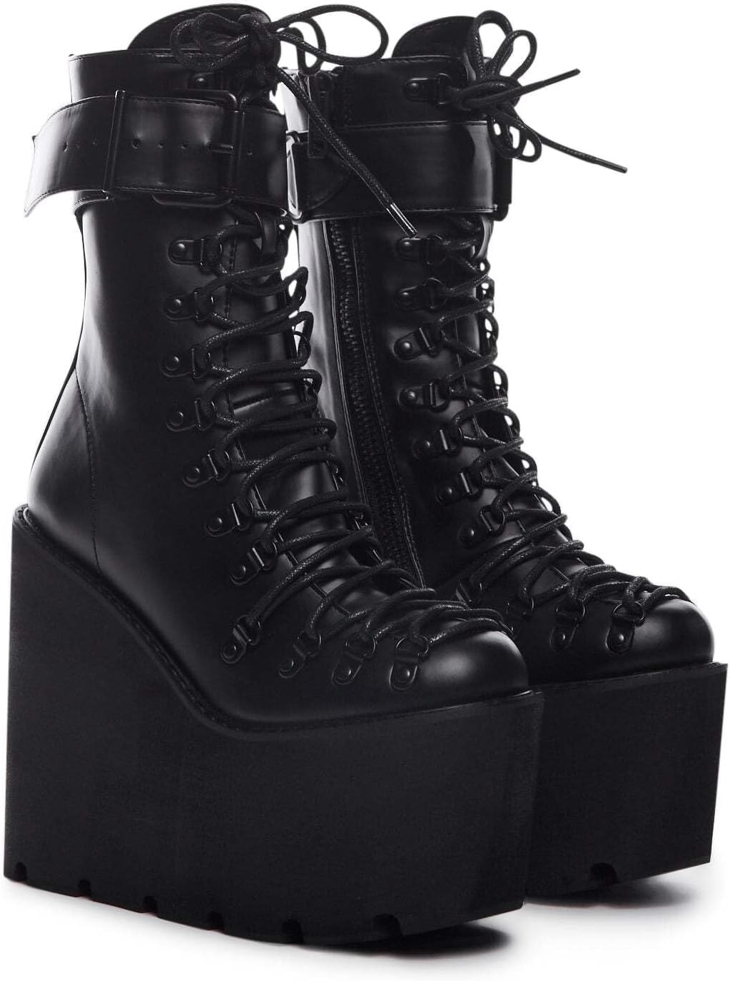 Turn betrayal into bold fashion with the Dolls Kill Traitor Boots by Current Mood. These ultra-high wedge platform boots are designed to command attention with their sleek black vegan leather construction and cutout treaded soles for an edgy, futuristic look. The full lace-up design extends all the way to the toe, offering a customizable fit, while the matte black hardware and wrapped calf straps with adjustable buckles add a rebellious touch. Side zip closures make slipping into these statement boots effortless. Whether you’re owning the streets or making a dramatic entrance, these platform wedge boots ensure you stay steps ahead.