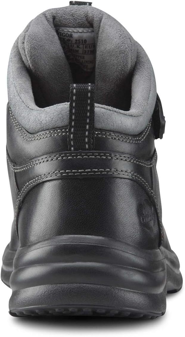 A versatile, lightweight hiking boot for both outdoor adventures and everyday wear. Featuring a hook and loop closure and a unique no-tie elastic lace, the Dr. Comfort Vigor offers a perfect blend of ruggedness and style. Crafted with full top-grain leather, it boasts a padded heel cup and tongue for enhanced comfort and protection. The easy-to-use no-tie elastic lace system ensures hassle-free wear. Whether you're at work or exploring the outdoors, the Vigor provides all-day comfort and stability. Key features include an adjustable hook and loop closure for personalized comfort, natural leather upper for temperature regulation, a protective toe box, durable construction, removable footbeds for orthotics, and extra medial and lateral support.