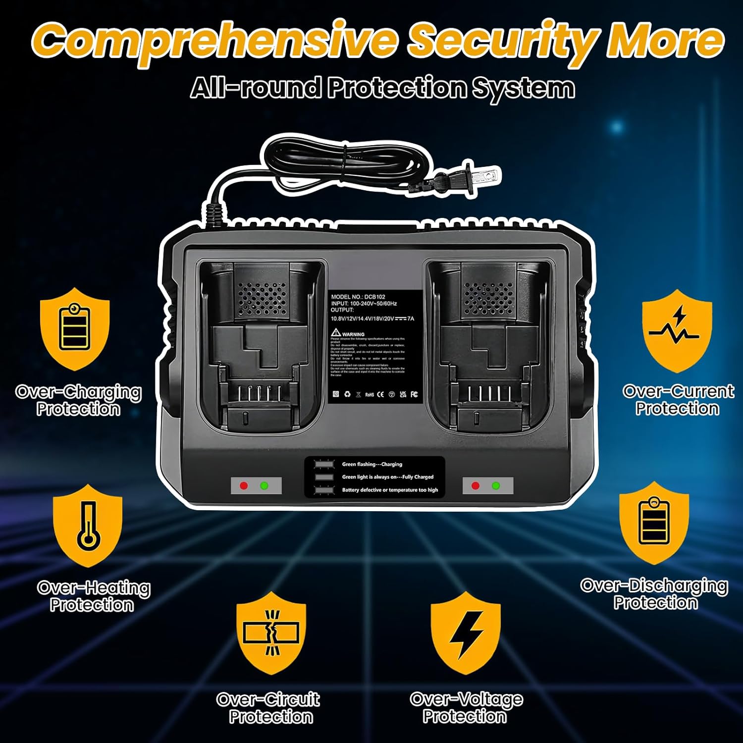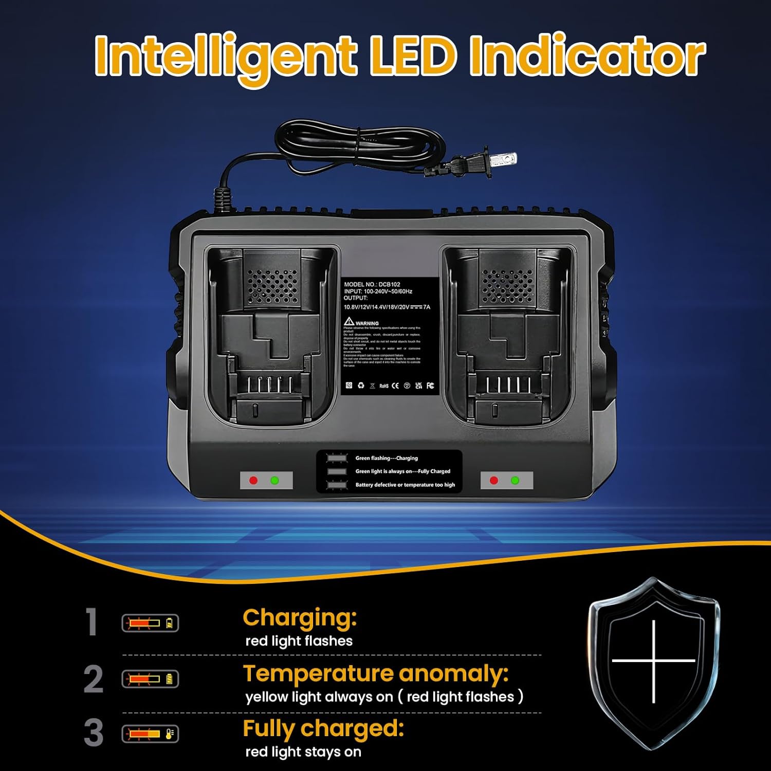 Fast 7ah DCB102 20V 60V MAX Battery Charger Multi Replacement for Dewalt Battery Charger DCB102 DCB101 DCB105 DCB112 DCB107 DCB104 DCB118, 2 Port Rapid Charger Compatible with DCB205 DCB606