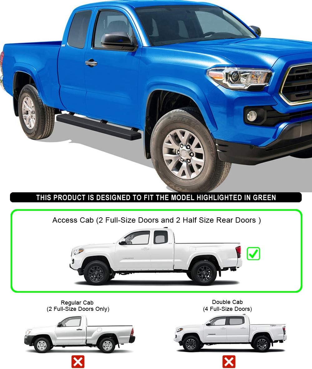 Fitments Compatible with Toyota Tacoma 2005-2023 Access CabIntroductioneBoard running boards fit good and look good on your truck. These custom fit running boards have a simple, clean design that put bulky and over styled nerf bars to shame. The eBoard's lightweight yet durable aluminum frame supports up to 500 lbs without bending. Having full length and non-slip tread, these running boards offer safe footing and superior access to your vehicle. Available in 3, 4, 5, 6 inch and a black powder coated or polished aluminum finish, eBoard running boards will outfit your truck in style.SpecificationMaterial: Extruded AluminumFinish: Black Powder CoatedStyle: Flat profile and straight - Full length step padInstallation: No drilling required, bracket custom mountItem Offered2pcs Aluminum Running BoardsAll Necessary Mounting HardwaresInstallation Instruction