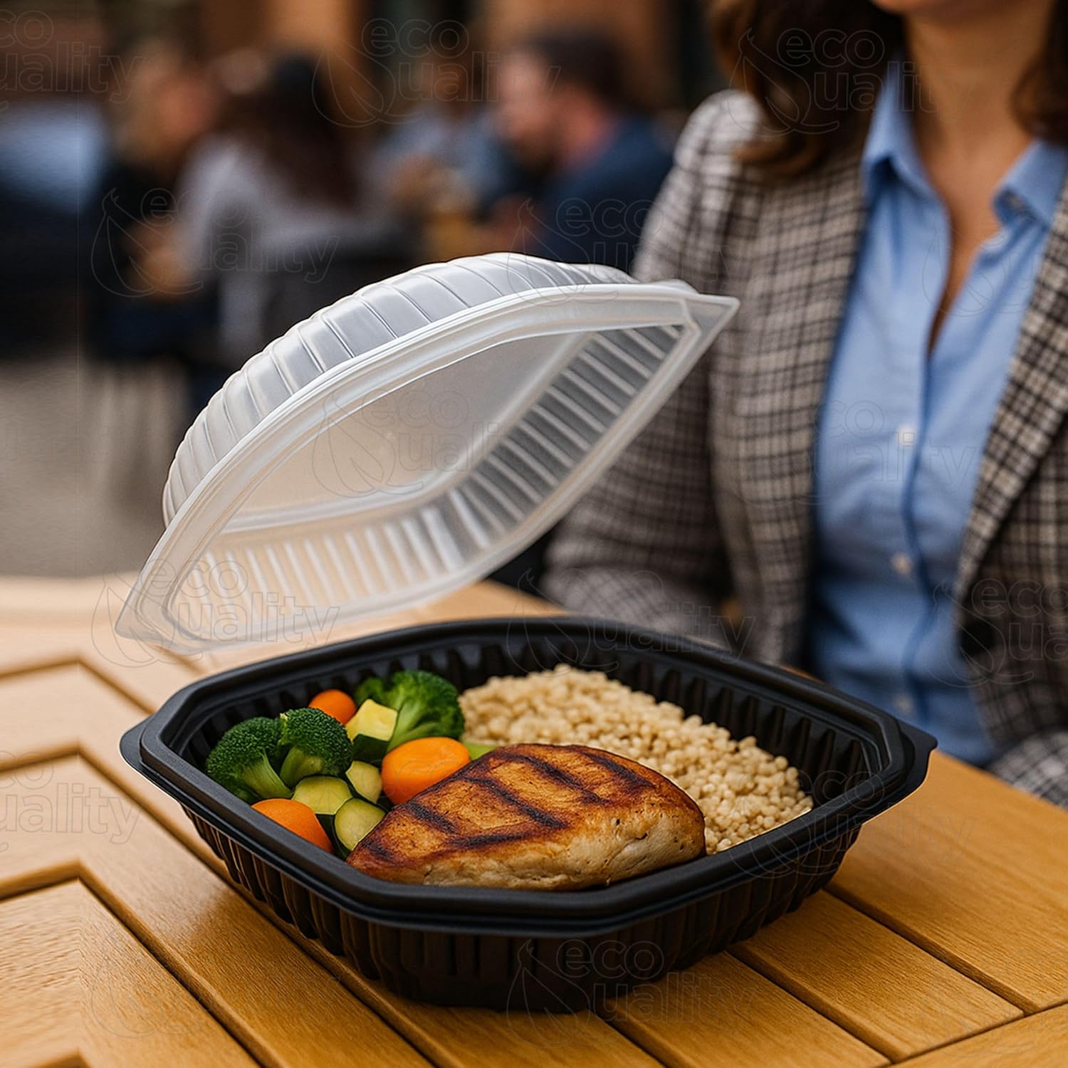 Serve, store, and transport meals with confidence using EcoQuality’s 48oz Hinged Black Clamshell Container with Clear Lid. Designed for commercial and home food service, this 11.5x10x3-inch container features a sturdy black base and a transparent lid to showcase contents while keeping food secure and fresh. Its spacious three-inch depth accommodates hearty portions, ideal for pastas, entrees, salads, and more. These containers are microwave-safe, recyclable, and stackable, making them perfect for meal prep, delis, food trucks, catering, and restaurant takeout operations. With a strong hinge and leak-resistant seal, it's a reliable solution for hot and cold foods.