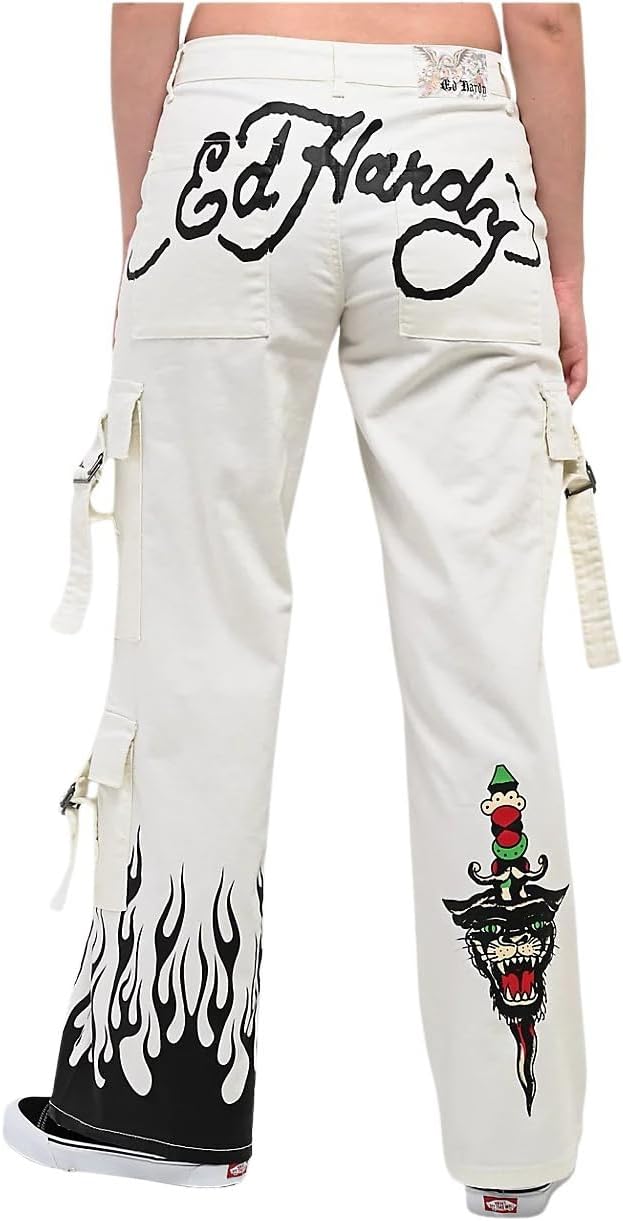 Ed Hardy presents the Fire Skull cargo pants with belted detailing throughout for alternative flair. The white jeans have black and red graphics throughout of flames, panthers, and other counterculture designs for a mall goth look.