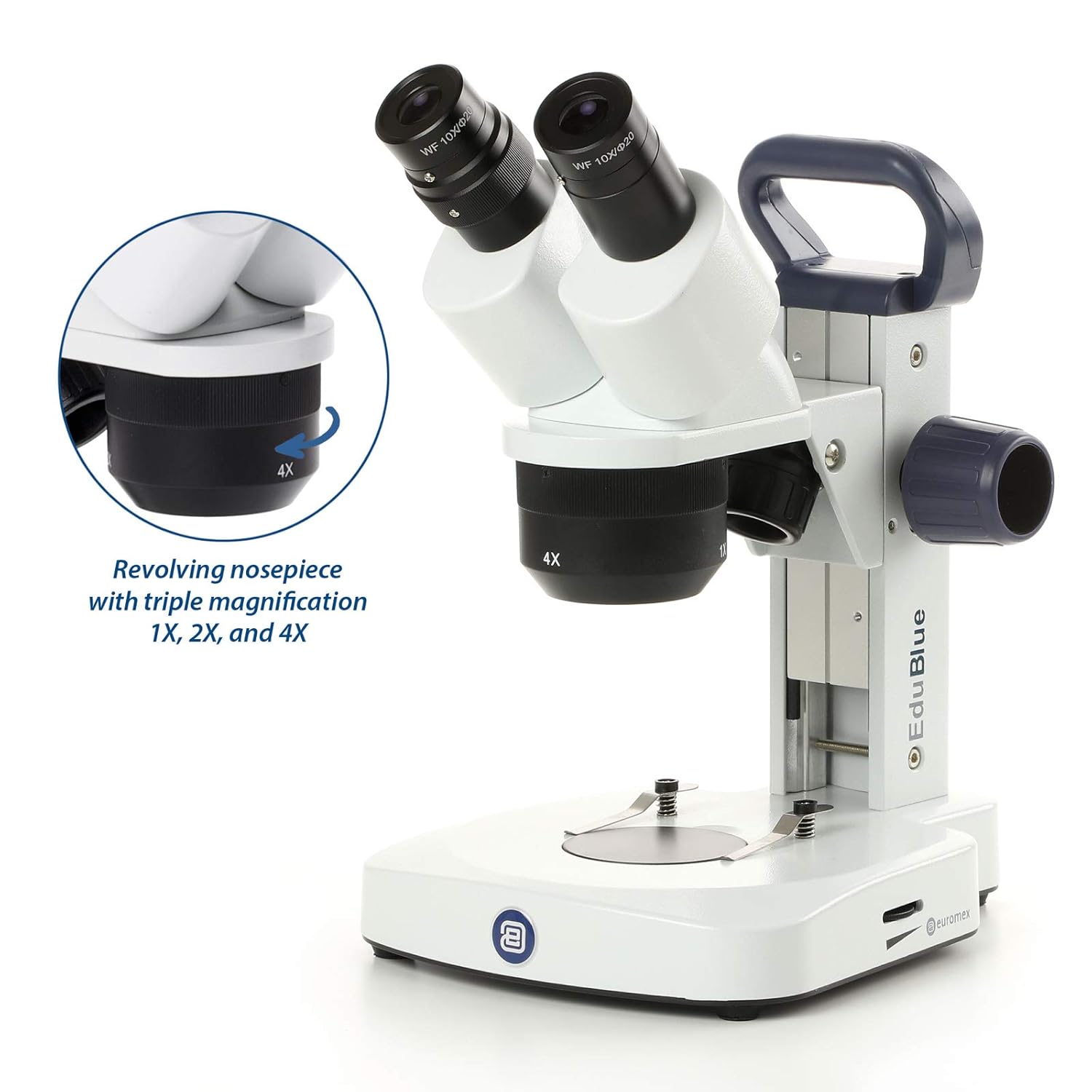 EduBlue binocular stereo microscope 1x/2x/4x revolving objective, 10x/20x/40x magnification, Rack and pinion stand, Incident and transmitted LED cordless illumination