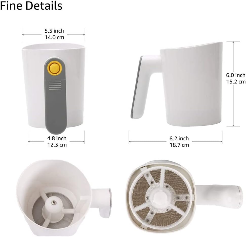The electric screen runs at 5600 RPM (revolutions per minute).The handle is very easy to hold and comfortable to use.Stainless steel mesh can be easily removed for cleaning and installation.Make small portions when sifting the powdered sugar.Make sure the screen is installed correctly before use.The screw is tightened and the sieve is kept low to prevent the powder from spreadingThe body can be cleaned directly, but do not clean the handle where the battery compartment is located, or immerse the body and handle in waterThe mesh screen is made of stainless steel and the body, handle and other parts are made of PC Large capacity: 4 cups / 32 oz / 1 literPowered by 2 AA batteries (not included), it's easy to find replacementsNote:Due to the different monitor and light effect, the actual color of the item might be slightly different from the color showed on the pictures. Thank you!Please allow 1-2mm measuring deviation due to manual measurement.Quantity : 1 pcs