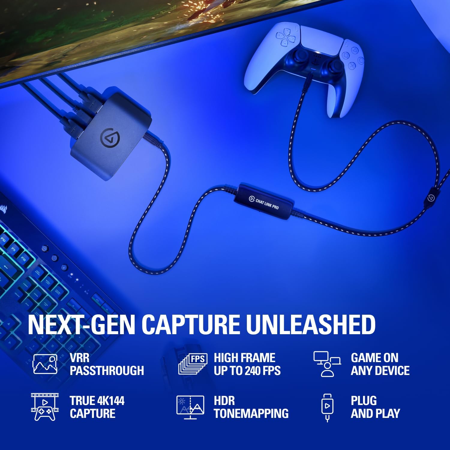 4K X is game capture at its best. Equipped with HDMI 2.1, our most powerful USB card lets you capture the latest titles up 4K at 144 frames per second – with ultra-low latency VRR passthrough for ultra-smooth frame rates, no compromises. Chat Link Pro lets you stream or record PS5, PS4, or Nintendo Switch voice and gameplay audio. Simply plug in, connect your controller and headset. Featuring a braided cable jacket for extra durability and a line isolator plus gold-plated connectors for optimum sound quality, Chat Link Pro is your premium solution for capturing all audio from your favorite gaming consoles. Technical Specifications Input: HDMI (unencrypted) Output: HDMI (lag-free passthrough) Recording & passthrough resolution: up to 4K144 HDR10 Support Dimensions: 112 x 72 x 18 mm / 4.4 x 2.8 x 0.7 in Weight: 91 g / 3.2 oz System Requirements Windows 10 (64-bit), macOS 11, iPadOS 17 or later 6th generation Intel Core i5 CPU (i5-6xxx) / AMD Ryzen 5 (or better) NVIDIA GeForce GTX 10xx (or better) USB 3.2 Gen 2 port (USB 3.2 Gen 1 works with reduced capture resolution) One cable guarantees a simple and quick setup. Extra-long 250 cm / 98 in cable enables freedom of movement. 3.5mm male connector plugs directly into your PS5 or PS4 controller. 3.5mm male connector plugs into the analog port of your capture card or line-in port of your computer. 3.5mm female connector accepts analog stereo headsets. Switchable line isolator. 4-pole 3.5mm (TRRS) Headsets Popular headsets equipped with a 4-pole 3.5mm connector are natively compatible with Elgato Chat Link Pro. This includes but is not limited to: CORSAIR VIRTUOSO RGB WIRELESS, CORSAIR HS35 Astro A40, Astro A30 Turtle Beach P12, Turtle Beach X07 Apple EarPods Stereo PC Headsets with Two 3.5mm Connectors PC headsets with 2x 3.5mm connectors (headphones/mic) are compatible with the Elgato Chat Link Pro cable when paired with a PC to 4-pole adapter.