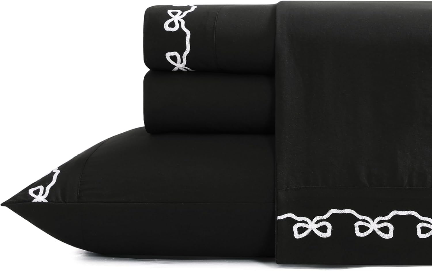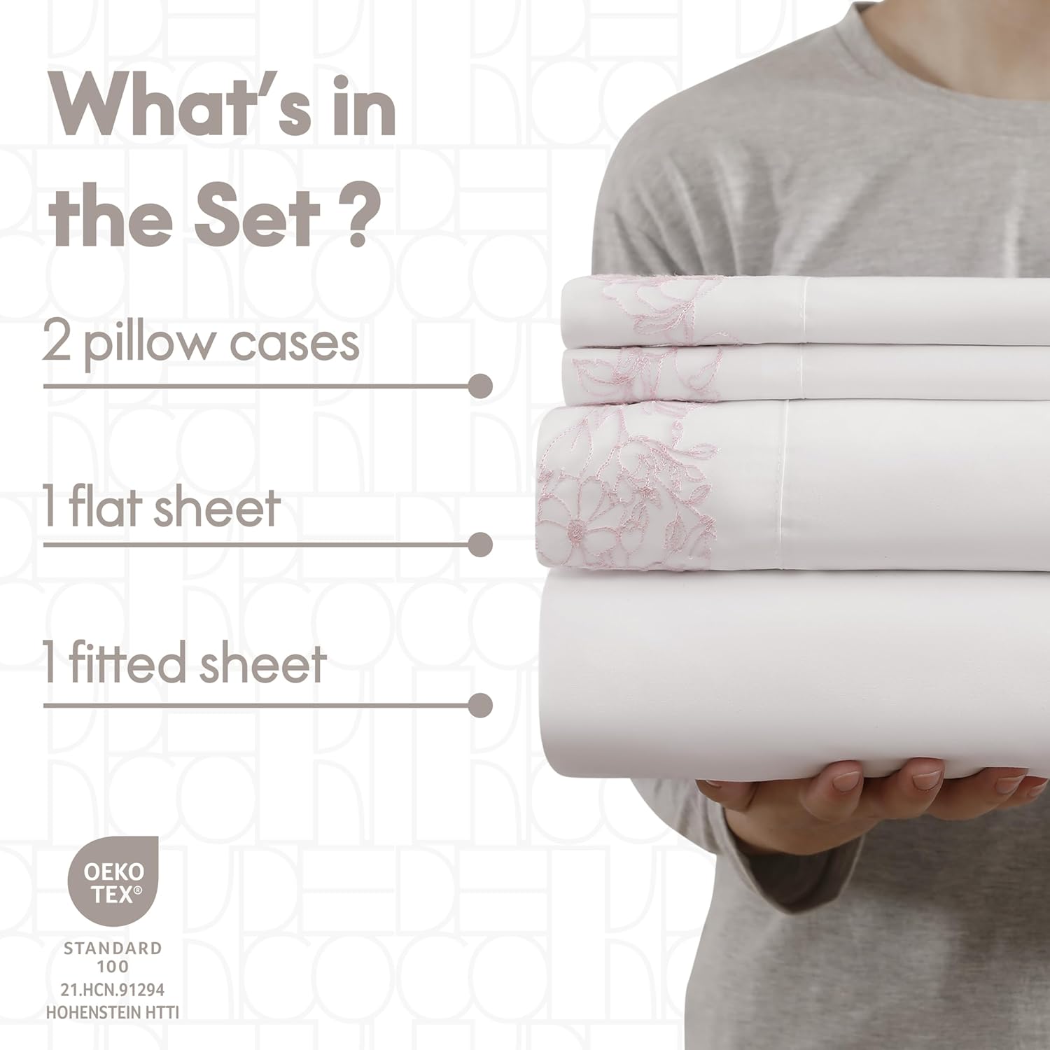 Add timeless elegance and everyday comfort to your bedroom with our beautifully embroidered 4-piece microfiber sheet set. Designed to blend classic vintage charm with modern convenience, this sheet set instantly elevates the look and feel of your sleeping space. Crafted from ultra-soft 100% polyester microfiber with a lightweight 85 GSM construction, these sheets are silky smooth to the touch and gentle on your skin. Whether you're curling up after a long day or getting ready for a lazy weekend morning, you’ll love the soft, breathable comfort they provide. The moisture-wicking, temperature-regulating design helps keep you cool and dry all night long, promoting a more restful and refreshing sleep. The complete 4-piece set includes one flat sheet (90"W x 102"L), one fully elasticized fitted sheet (60"W x 80"L) with 12-inch deep pockets to fit most mattresses, and two standard pillowcases (20"W x 30"L each). Thoughtfully designed to stay in place, the fitted sheet hugs your mattress securely without slipping or bunching. Practical as they are beautiful, these sheets are easy to care for—just machine wash and tumble dry on low for lasting softness and durability, wash after wash. Whether you're outfitting a master bedroom, guest room, or college dorm, this embroidered sheet set brings classic style, everyday luxury, and effortless care into any home. Transform your bed into a serene, stylish retreat—your perfect night’s sleep starts here.