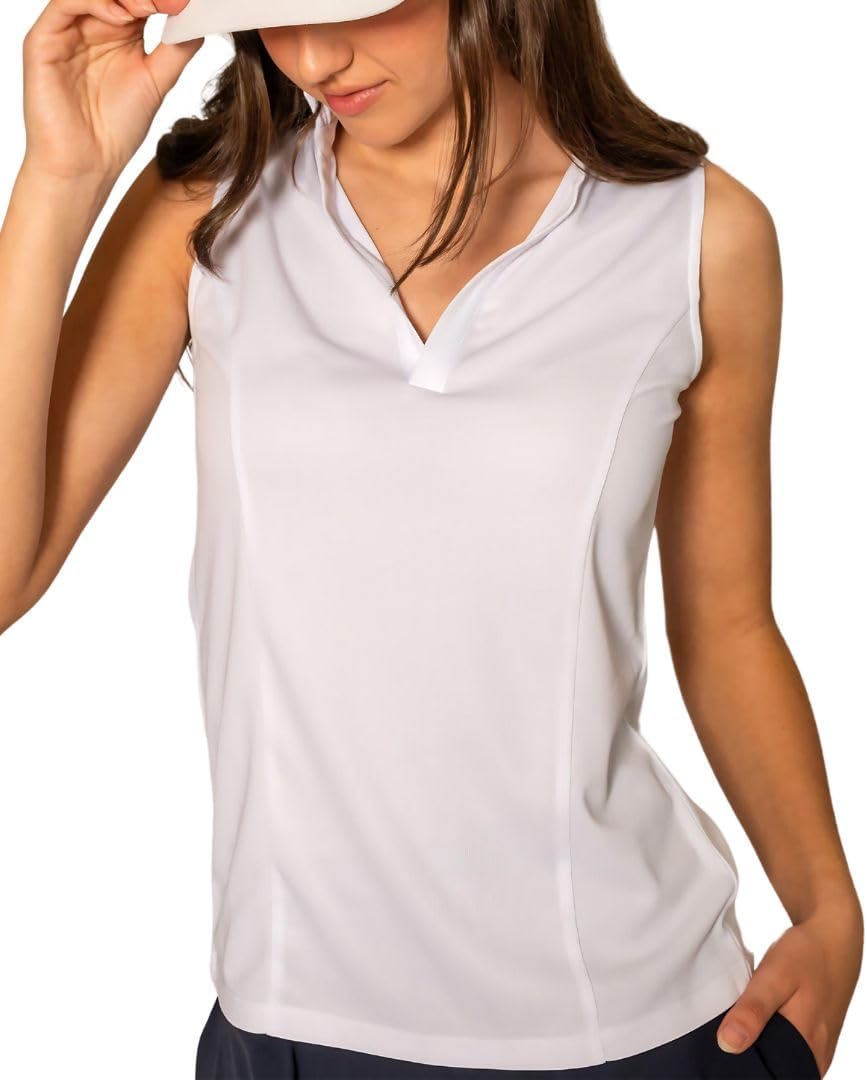 The Ellie Day Sleeveless Ruffle Collar Top is a stylish and versatile addition to any woman's wardrobe. Crafted from high-quality materials, this golf shirt features a sleeveless design with a feminine ruffle collar, adding a touch of elegance to your on-course or casual look. The crisp white color is timeless and easy to coordinate with various bottoms, from tailored shorts to skirts or slacks. Designed with breathable fabric, this top ensures you stay cool and comfortable during your round or while running errands. The ruffle collar adds a delicate touch of sophistication, making this top suitable for both athletic and casual settings. Whether you're hitting the links or meeting friends for brunch, the Ellie Day Sleeveless Ruffle Collar Top is a versatile choice that combines style and functionality.