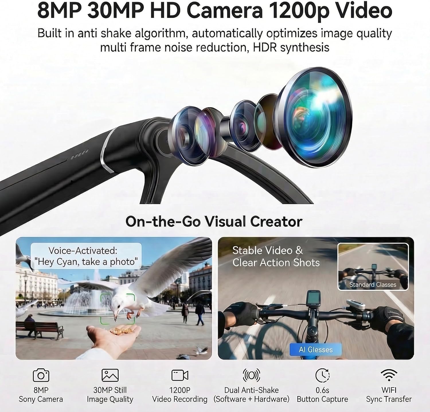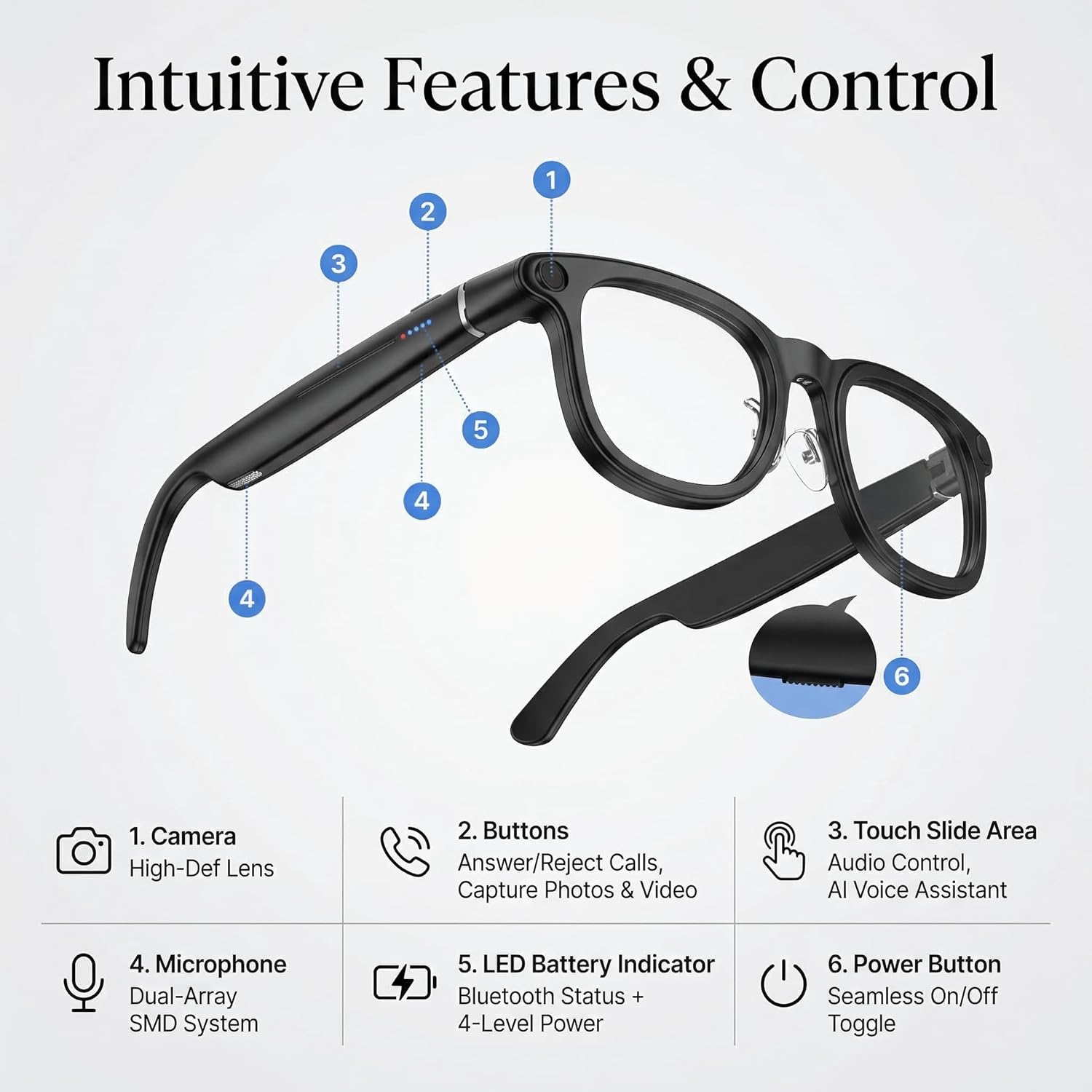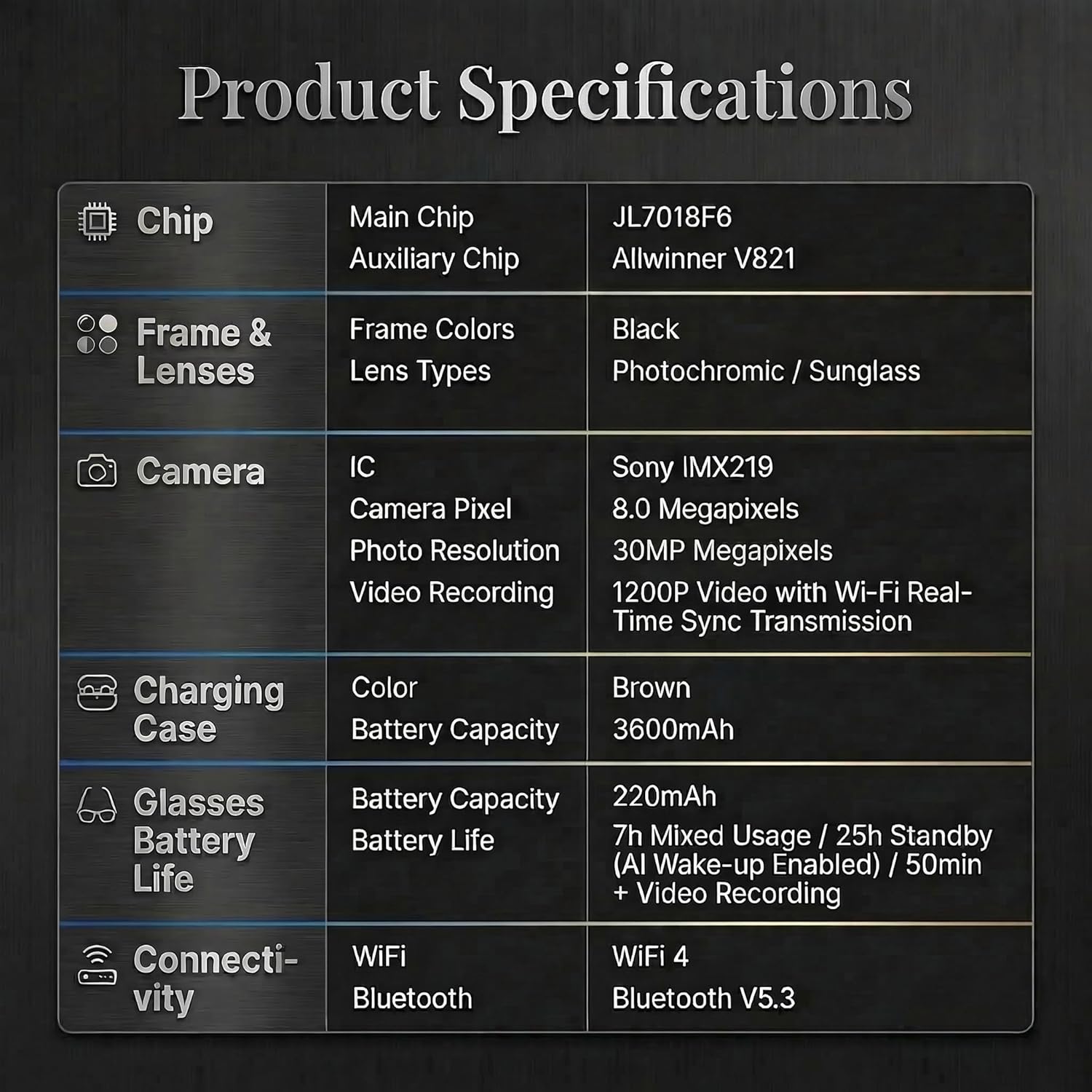 | BuiltIn Media | A 3600mAh charging case., A magnetic charging cable, A pair of non-slip ear hooks+A glasses cleaning cloth, A pair of smart sunglasses with a camera+A pair of photochromic lenses, A smart glasses user manual |