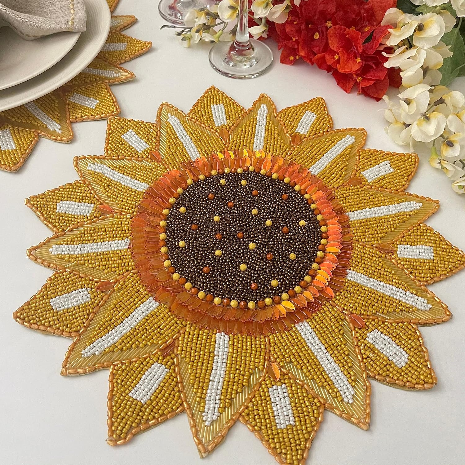 This beautiful beaded placemat or table mat is made using multicolour beads. This looks stunning on any table. This is a handmade product. Created with a lot of precision. We use the best beads to create the designs. These placemats look great as a set on the dining table or as an individual mat in the living room or bedroom. While creating these, we take extra care to tie all the knots and secure them properly. These are ideal for the living room and dining room. This will add glamour, texture, and interest to your table.