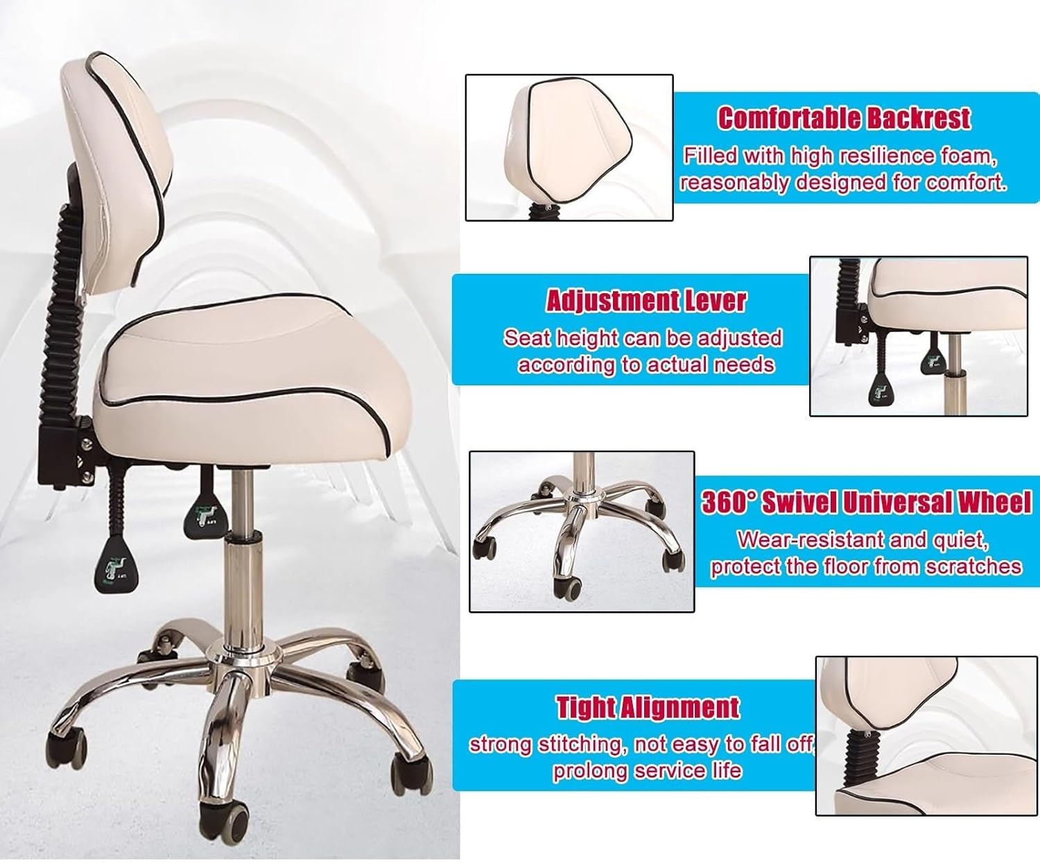 The Ergonomic Dental Saddle Chair with Back Support is specifically designed for individuals who spend extended periods sitting and require both comfort and support throughout the day. Whether you're a dental hygienist, tattoo artist, hair stylist, or medical professional, this rolling stool helps maintain good posture, reduce back pain, and improve comfort during long working hours.This ergonomic saddle chair features a contoured seat that promotes proper spine alignment, alleviating pressure on your back and lumbar discs. The chair’s heavy-duty construction includes a thickened steel center pole and metal legs, it can support up to 440 lbs (200 kg) without compromising stability.The height adjustable seat, ranging from 48cm to 61cm, allows easy customization with a one-hand lever, providing optimal comfort for different users. The 360° swivel and smooth-rolling casters make it easy to move around your workspace, while the quiet operation a distraction environment.Designed to be versatile, this saddle stool is ideal for a variety of settings including dental offices, beauty salons, tattoo studios, medical clinics, workshops, homes, and more. If you need a reliable, comfortable, and stylish chair that helps you stay productive, this ergonomic saddle stool is the perfect choice for your workspace.