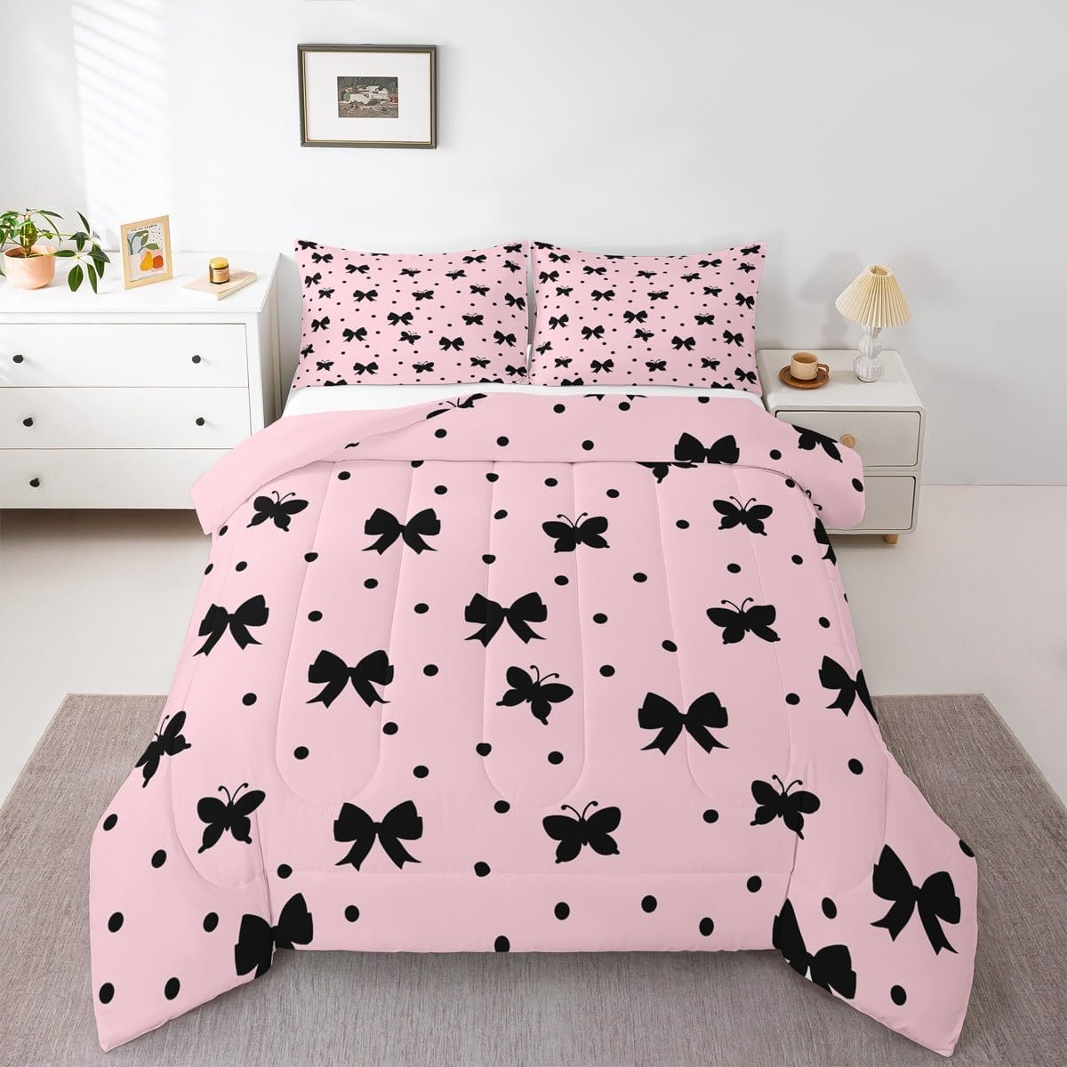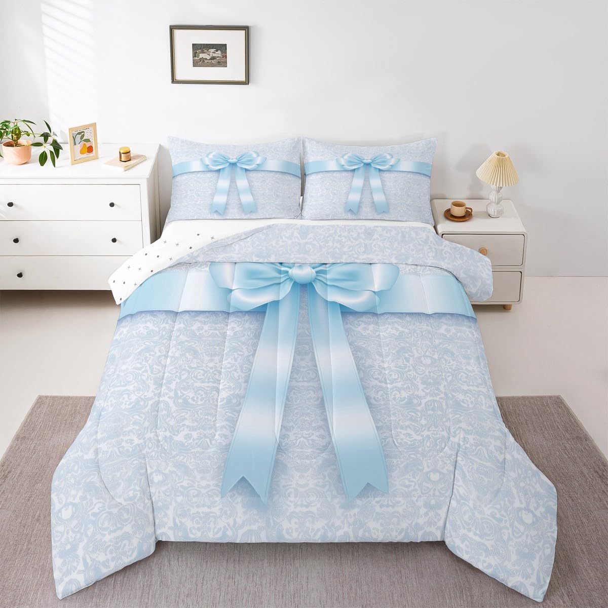 Size Information Toddler size: 1 Down Comforter 42"W x 58"L, 1 Quilted Pillowcase 30"W x 20"L. Twin size: 1 Down Comforter 68"W x 90"L, 1 Quilted Pillowcase 30"W x 20"L. Full size: 1 Down Comforter 79"W x 90"L, 2 Quilted Pillowcases 30"W x 20"L. Queen size: 1 Down Comforter 90"W x 90"L, 2 Quilted Pillowcases 30"W x 20"L. King size: 1 Down Comforter 104"W x 90"L, 2 Quilted Pillowcases 36"W x 20"L. Versatility We have many kinds of styles for you to choose. You can easily find a product that suits the style of your room. The item is not only Suitable for your home, bedroom, guest room, living room, or rv, your families, friends, relatives, boyfriend,girlfriend. Modern Design The luxury aesthetic comforter set is made reactive printing and dyeing process. The pattern is clear, the color is bright, which will not fade after repeated washing. Personalized As a manufacturer of digital printed home textiles, we follow current trends and bring you the latest and stylish home textile products. The item will make the room decorated in exquisite taste. We sincerely hope you will love the bed set.