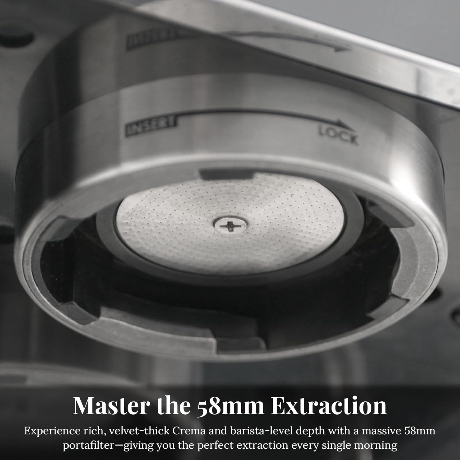 | Other Special Features of the Product | 15-bar Italian ULKA Pump, 58mm Portafilter, 78oz Removable Water Tank, Adjustable Steam Wand, Stainless Steel Conical Burr Grinder |