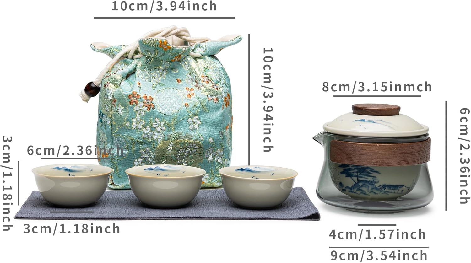 | Included Components | Glass Brew cup with lid x 1, Porcelain Kongfu tea cup x 3, Tea infuser x1, Mat *1, Portable cotton carring bag x 1 |