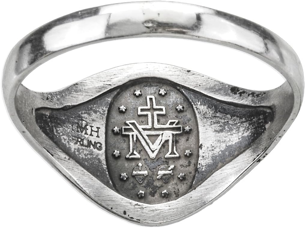 Sterling Silver Miraculous Medal Ring. This sterling silver Miraculous Medal Ring is a beautiful expression of faith. The detailed design features the traditional Miraculous Mary image, making it a tasteful addition to any Catholic's jewelry collection. Celebrate your devotion with this luxurious ring, crafted with elegance and sophistication in mind.