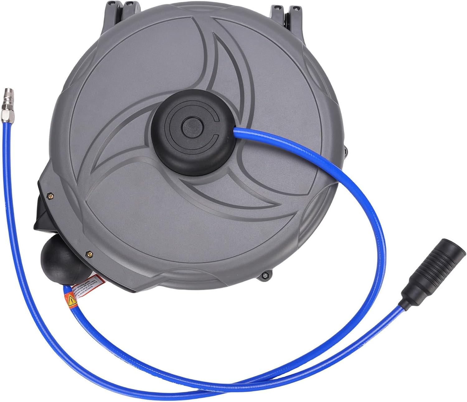 [ Free Operation] Experience effortless usage with our hose reel engineered to eliminate tangling. a gentle pull is all it takes for the air hose to retract smoothly enhancing your workflow and making your tasks more enjoyable. say goodbye to frustrating knots and messy hoses. [Portable and Convenient] Designed with a sturdy portable handle our hose reel offers easy mobility around your workplace. move it effortlessly to any location optimizing your productivity and adapting to your dynamic work environment without hassle. [Automatic Rewind Technology] Equipped with advanced auto rewind technology our air hose reel simplifies the coiling process saving you time and effort. maintain a tidy and efficient work space with this smart and innovative tool designed for modern professionals. [Versatile Application] Our automatic retractable hose reel is perfect for a wide range of environments including auto repair shops workshops home studios garages and mobile mechanics. its robust design ensures it can handle the demands of industrial applications while providing convenience and efficiency for everyday use. [Durable and Reliable] Built to last our hose reel prevents bending leaks and wear ensuring long term performance and safety. the materials and construction guarantee a clean and organized work space while standing up to rigorous use over time. Spec: Item Type: Retractable Hose Reel Material: ABS Connector: Standard Self Locking Quick Connector Material: New PP Plastic Working Pressure: Approx. 15kg / 33.1 lb(approx.) Length: Approx. 12m / Approx. 39.37ft Package List: 1 x Automatic Retractable Hose Reel 2 x Accessories 4 x Expansion Screws 1 x Screw 1 x User Manual How To Use: Use directly!