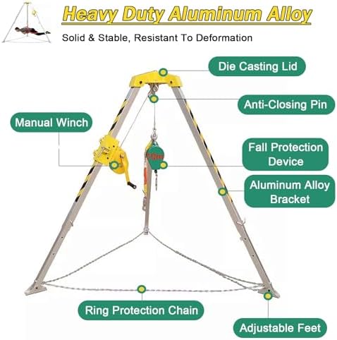-Emergency Firefighting Rescue Rope System: Description: Are you still worried about working in high places, cliffs and confined spaces? Our tripod rescue system can help you solve this trouble. In an emergency, our Confined Space Rescue Tripod can help rescuers conduct rescue operations more efficiently and ensure the safety of trapped people. Features: Adjustable angle feet, can be installed in wellheads, pits and is not limited by the unevenness of the ground. For lifting, lowering and positioning of personnel and materials within confined space applications. Durable winch for lifting, lowering and positioning people and materials in confined spaces. It is lightweight and foldable, making the tripod convenient to store and transport. Safety chain Strengthens support for demanding confined space applications. Telescopic support leg, height adjustable according to working condition. Widely used in firefighting, municipal and rescue organizations. The fall protector provides double protection for the constructor. Ring protection chain prevents slipping or moving while in use. Heavy duty aluminum alloy, sturdy and durable. Specification: Material: Aluminum Alloy Wire Cable Length: 20m/66ft, 30m/98ft Adjustable Heigth: 1.34-2.14m/4.4-7ft Man Winch Continue Efficiency: 5:1/8:1 Rated load: 1200LBS winch safe load 200KG/440LBS; 1800LBS winch safe load 300KG/660LBS; 2600LBS winch safe load 400KG/880LBS. Package Includes: 1 x Rescue Tripod Kit ( Includes winch, cable, safe belt,.) Tips: Minor errors can occur due to different batches and manual measurements. Thank you for your understanding.