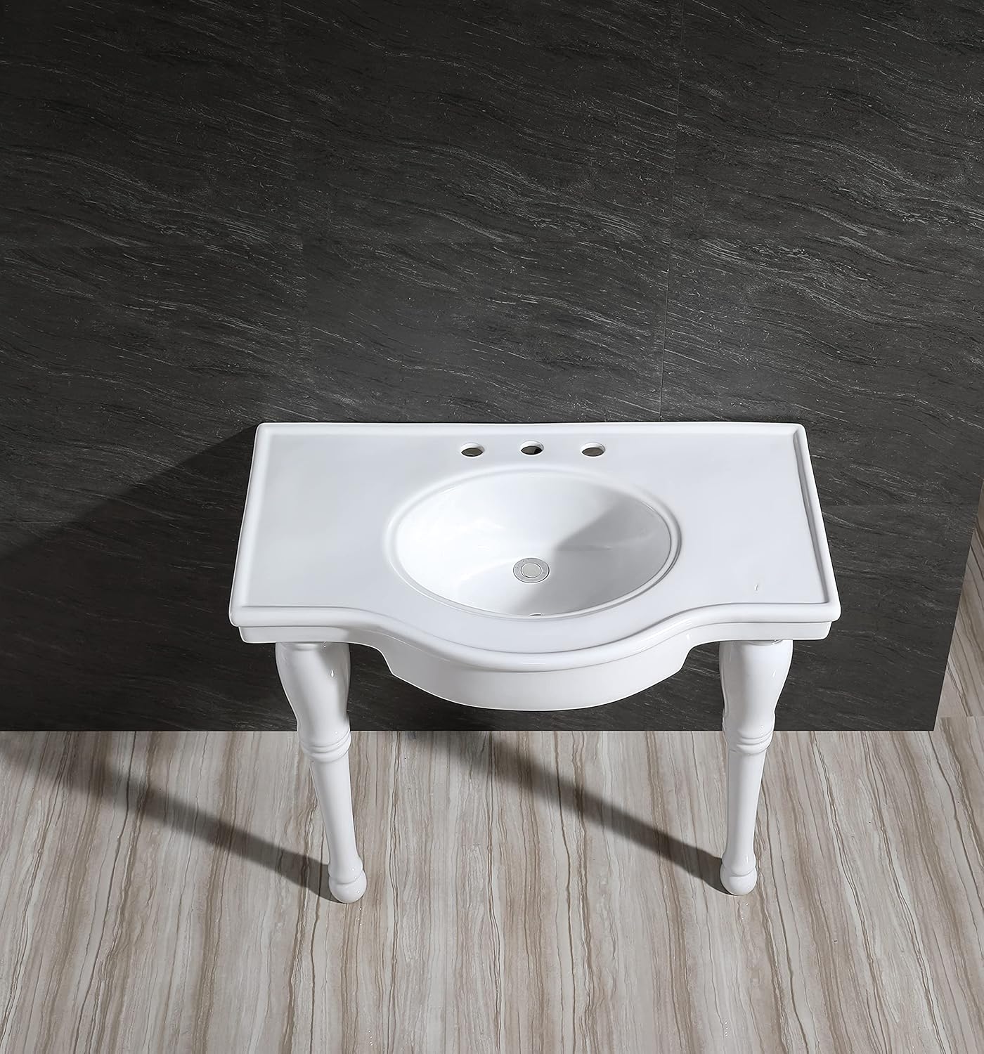 From Kingston Brass, this basin console with pedestal was designed with a striking design that will make almost any interior stand out. Constructed from solid ceramic, appreciate the finished glow that the console gives off. Installation of the console is on two legs and is mounted on the wall of the interior room. The console comes with a generous bowl size, while the overall console dimensions are (L)37-3/8 inch x (W)21-5/8 inch x (H)31-7/8 inch and is included with pre-drilled holes perfect for a 3-hole faucet install. The console's smooth texture allows for easy-to-clean and easy-to-manage maintenance. The console is also finished with a sleek white color that brings out the texture and the design of the ceramic material.