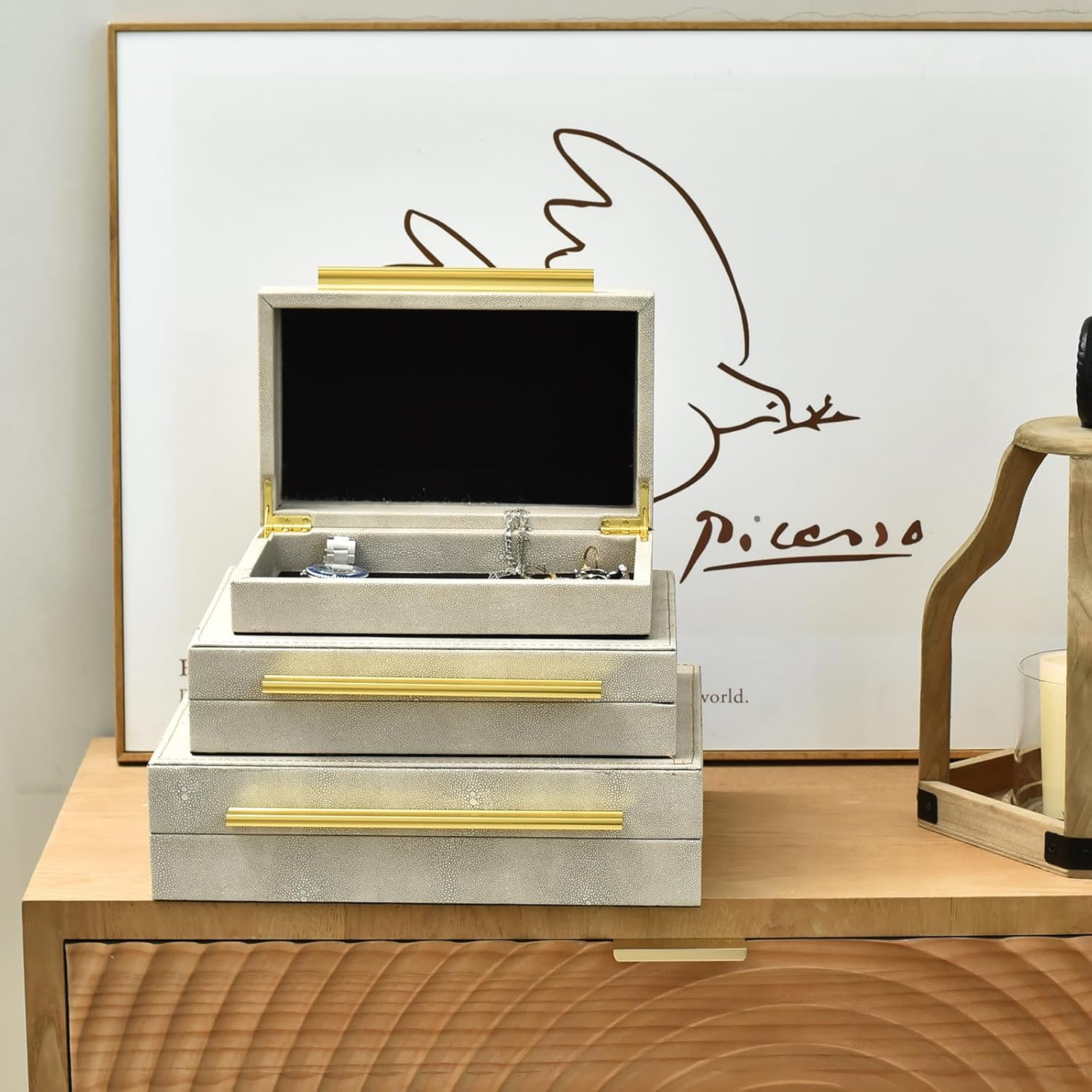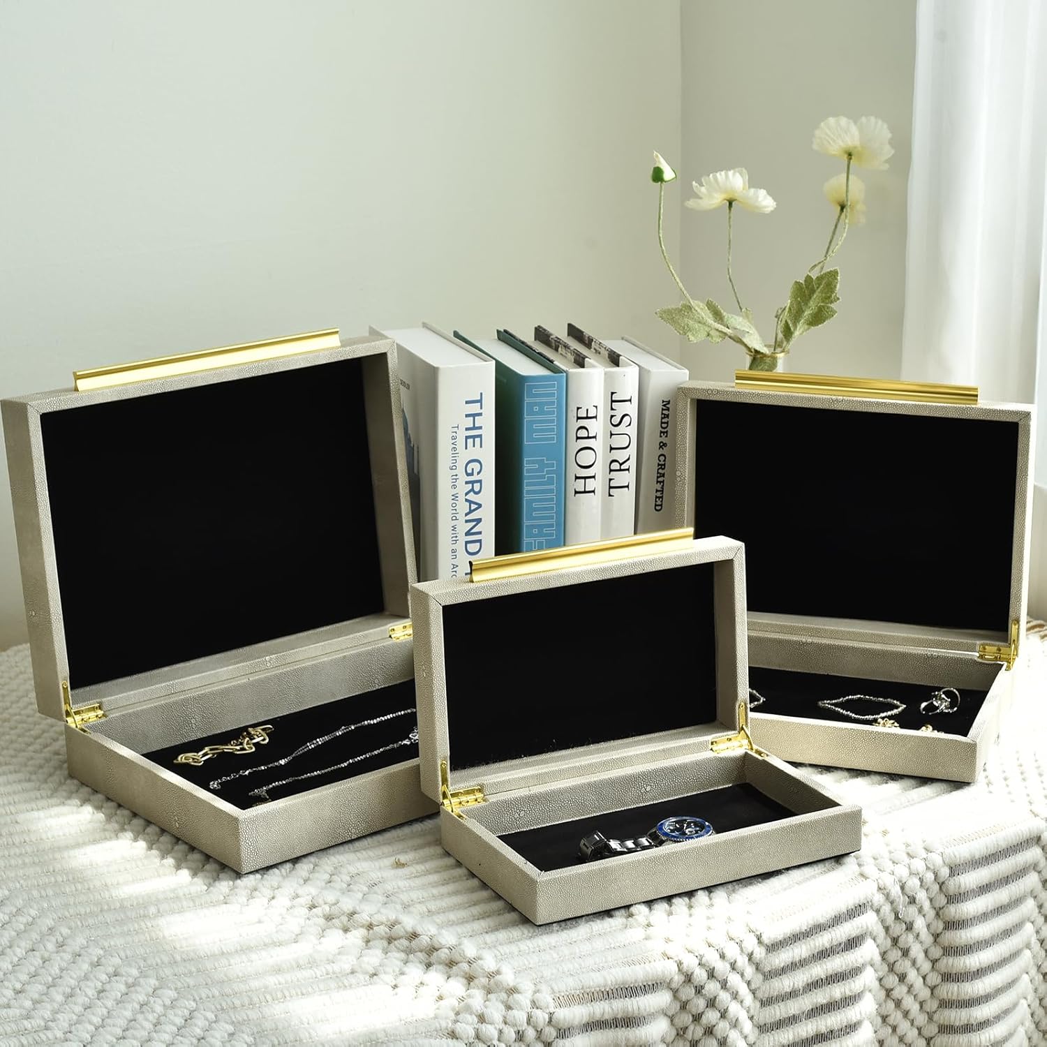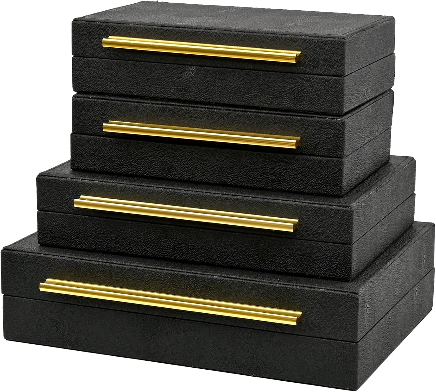Elevate Your Organization with Gallery-Chic Sophistication Transform clutter into a design statement with the DECOR4SEASON Faux Shagreen Storage Box Set. Moving beyond standard smooth organizers, these boxes feature a rich, pebbled PU leather texture that mimics the exotic look of authentic shagreen. The tactile finish offers dimensional depth that looks and feels expensive, providing a striking contrast against the sleek gold metal handles. Designed for Protection and Ease While they look stunning on a coffee table or bookshelf, these boxes are built for serious storage. The interior is lined with plush velvet to prevent scratches on your valuables, from delicate necklaces to oversized sunglasses. Engineered for daily use, the lids are equipped with high-quality metal quadrant hinges that keep the box open while you select your accessories—ensuring the lid never slams shut on your hands. Versatile Styling for Any Room Whether stacked to create vertical height on a vanity or separated to organize multiple spaces, this set of three (Large, Medium, and Small) adapts to your lifestyle. Use the large box for remotes and tech in the living room, and the smaller boxes for jewelry and watches in the bedroom. They blend seamlessly with styles ranging from modern minimalism to sophisticated glam.