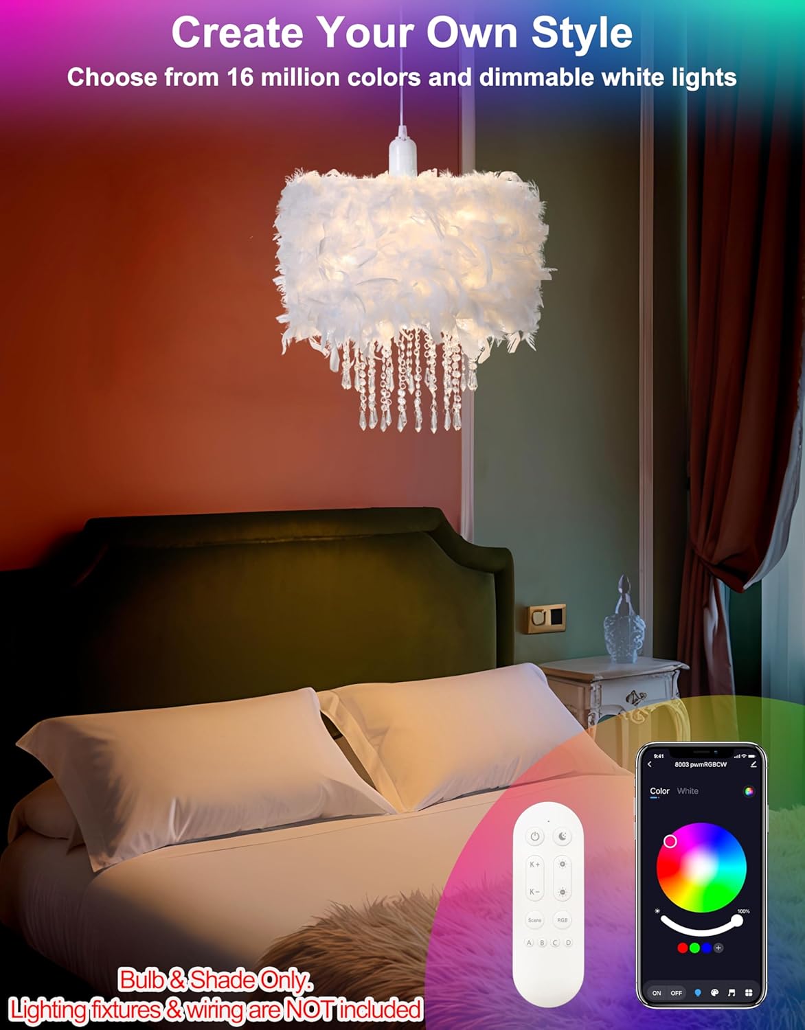 | Additional Features | Handcrafted Feather Design, Integrated Bluetooth Speaker, Smart RGB Lighting Controls |