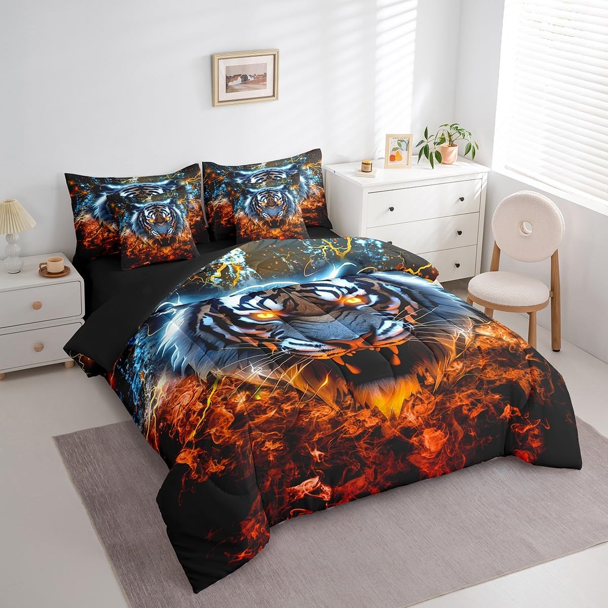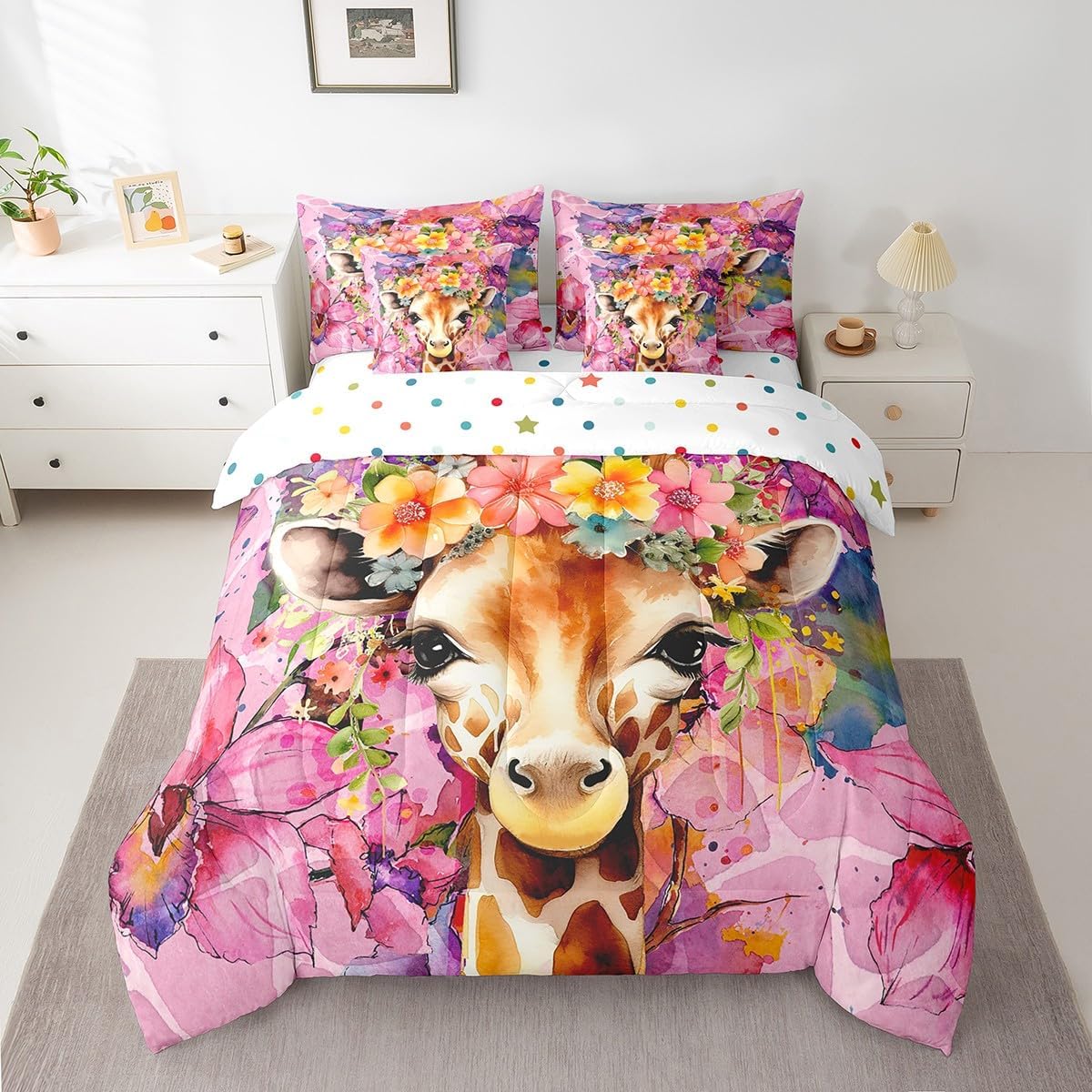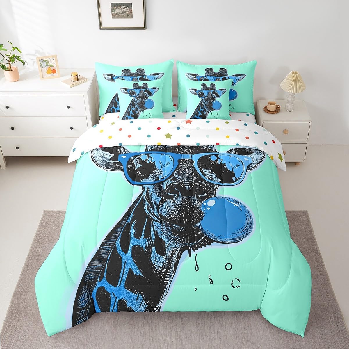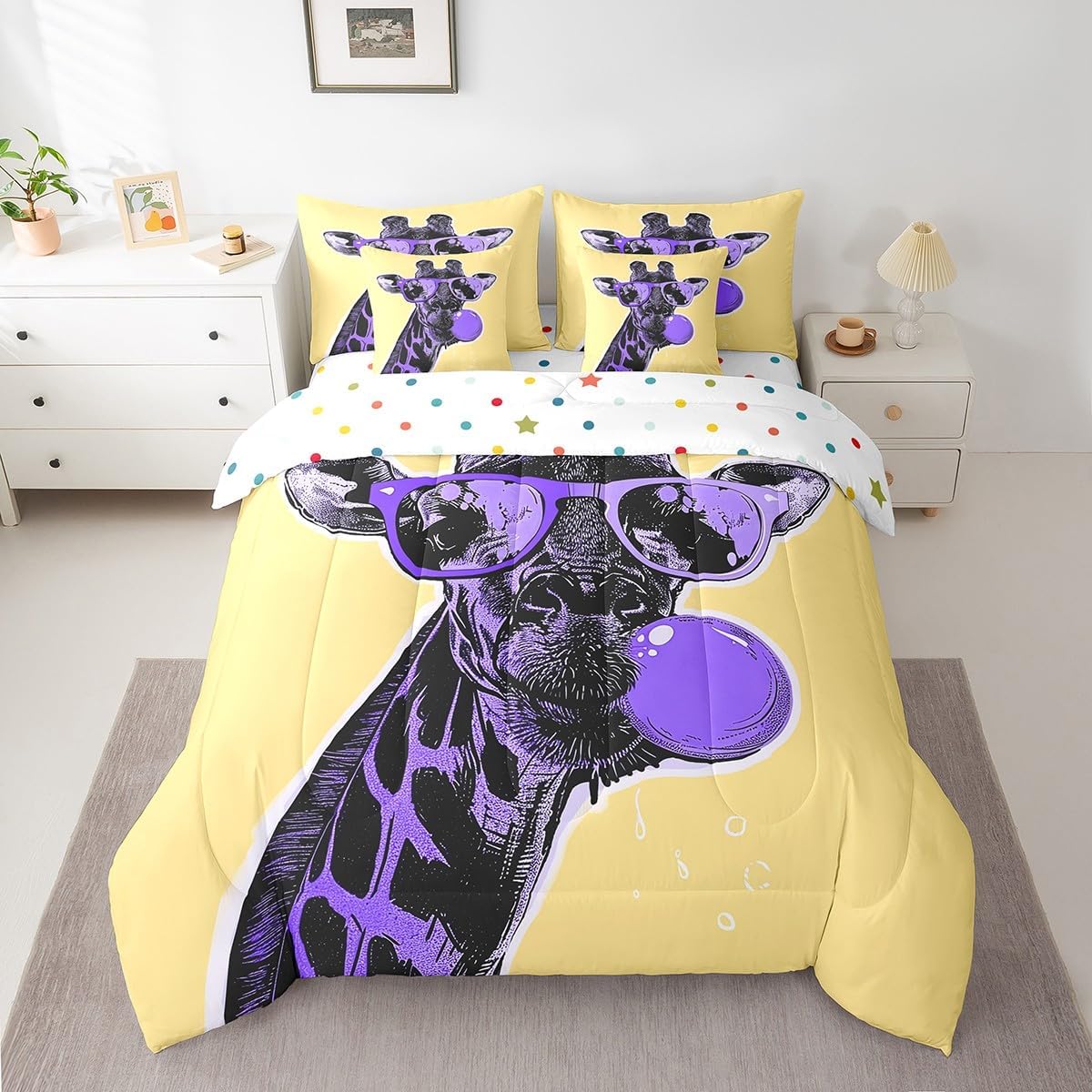 Why choose us Everyone has their own preferences; we develop different styles and different designs to suit the hobbies and aesthetics of different people; we look forward to bringing more joy and fun into your life; special design for special you; it's not just a simple home product, it's a way of life Brighten up your bedroom with this bed linen set; this bright and colourful bedding set features vibrant colours and special print pattern; turn the reversible duvet set over for a new look against a modern geometric background Convenient to use due to polyester which is super soft and comfortable; this all year round bedding is designed to be lightweight and breathable for a good night's sleep; a practical product for homes, dormitories, hotels, guest rooms Twin bedding set includes 1 twin comforter: 68"x90", 1 fitted sheet: 39"x75"x16", 1 flat sheet: 66"x96", 2 Pillowcases: 20"x30", 2 square pillow covers: 18"x18", perfect for a twin size bed. Full bedding set includes 1 full comforter: 79"x90", 1 fitted sheet: 54"x75"x16", 1 flat sheet: 81"x96", 2 Pillowcases: 20"x30", 2 square pillow covers: 18"x18", perfect for a full size bed. Queen bedding set includes 1 queen comforter: 90"x90", 1 fitted sheet: 60"x80"x16", 1 flat sheet: 90"x102", 2 Pillowcases: 20"x30", 2 square pillow covers: 18"x18", perfect for a queen size bed. King bedding set includes 1 king comforter: 104"x90", 1 fitted sheet: 78"x80"x16", 1 flat sheet: 90"x106", 2 Pillowcases: 20"x36", 2 square pillow covers: 18"x18", perfect for a king size bed. In addition to this comforter set with sheets, there are curtains, area rugs, shower curtains, blankets and other furniture with the same design waiting for you to explore. Whether it is for birthday of your family or friends, relatives, or just for yourself, the item should be interesting and authentic.