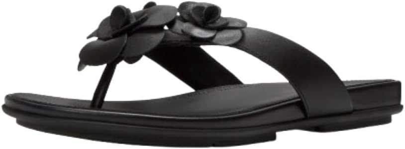 The FitFlop Gracie Flower Leather Flip-flops are slide slippers styled with floral detail. These slip-on thongs are made of a leather upper, a rubber insole, and a polyester lining. Easy to slip on and off, these flip-flops are a great choice for your beach trips and casual strolls. Open, round toe silhouette. Low, wedge heels. Slip-resistant rubber outsole.
