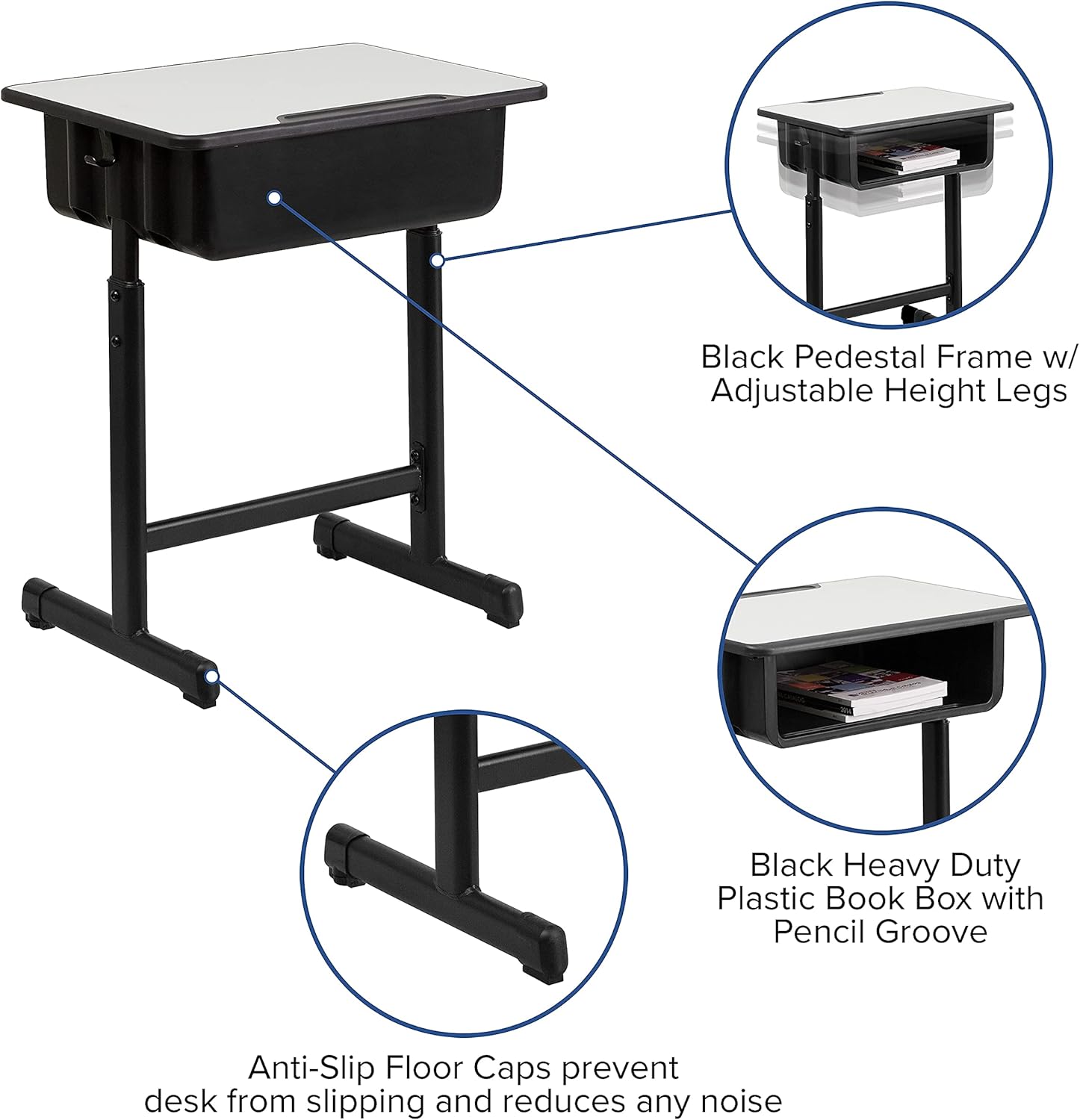 Amplify any classroom or workspace with the functional convenience of the Flash Furniture Billie Student Desk. This classroom desk makes for the perfect addition to any classroom for students from elementary through high school, a dedicated workspace for homework, or a home school desk for remote classes. Great for hardworking students of all sizes, the school desk is designed with height-adjustable legs to fit the needs of each student, and the legs feature floor caps that prevent the desk from wobbling on uneven flooring. The classic open front desk features a 0.75" thick high-pressure laminate top, offering plenty of room for your students to spread out their assignments, open textbooks, and write or draw. Under the desktop, a spacious, heavy-duty metal book box provides ample storage space for students to tuck away their books, writing utensils, papers, and other school supplies or personal belongings. The black pedestal frame features dual book bag hooks that provide the perfect place to store backpacks and coats. This portable classroom desk measures 23.625" W x 17.75" D x 28.25-31.5" H, providing the perfect amount of work space while fitting neatly in any classroom or workspace.