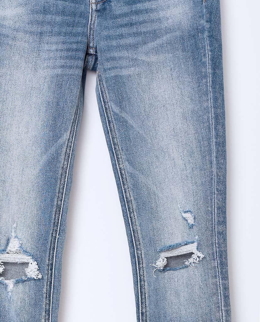 Distressed mid-rise skinny jeans | Mid-weight stretch denim | Five pocket style | Fading and whiskering wash | Shredded holes at the knees and frayed hems | Ankle to regular length | Button and concealed zip fastening front