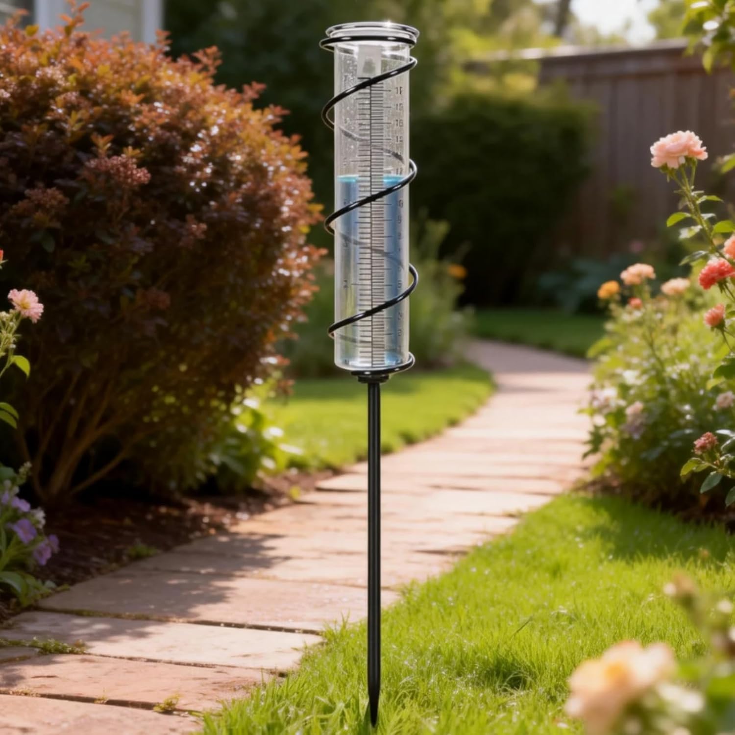 Transform your garden monitoring with this elegant spiral-design rain gauge. Standing 22.5 cm tall, this FOTIOMRG gauge features a clear plastic tube mounted on a durable metal stake, making it both functional and decorative. The spiral design adds a stylish touch while providing accurate rainfall measurements for your garden, yard, or lawn. With easy-to-read markings and a diameter of 5.7 cm, this gauge offers precise water measurement capabilities. The innovative spiral holder securely maintains the tube's position while adding visual interest to your outdoor space. Installation is straightforward - simply insert the stake into your desired location and remove it when needed. This practical tool helps you monitor rainfall levels effectively, ensuring proper water management for your plants. The transparent tube allows for clear visibility of water levels, while the sturdy construction ensures reliable performance in various weather conditions. Perfect for gardening enthusiasts who want to combine functionality with aesthetic appeal in their outdoor spaces.