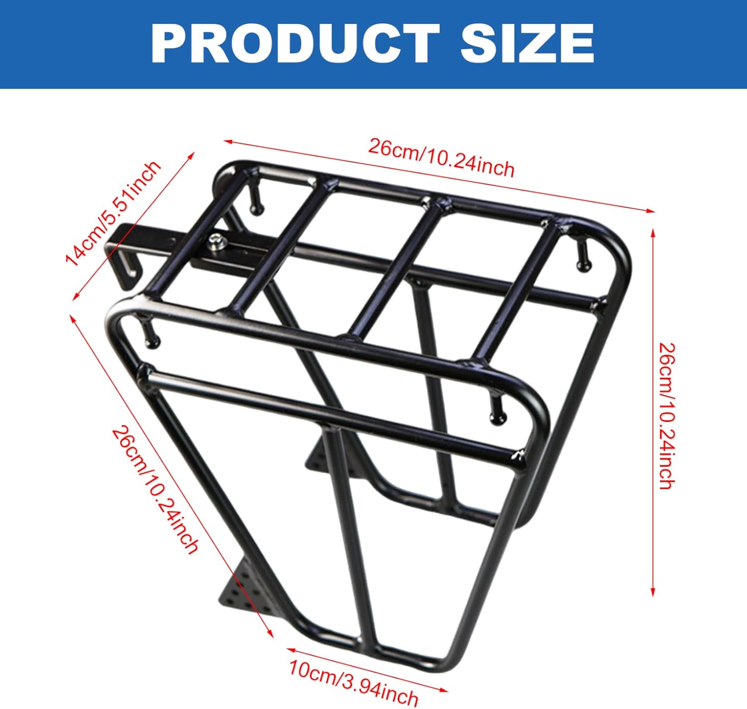 Description: This front bike rack is designed specifically for bikes with front forks that feature mounting holes on both outer sides, including touring and hybrid bikes. The heavy-duty aluminum alloy construction provides durability and strength to carry various cargo securely on the top platforms. Its trapezoidal shape enhances stability, while the adjustable connecting rod ensures a customized fit to your bike frame. The rack supports carrying cargo on top as well as attaching bags on both sides, offering versatile storage options for daily commuting or long-distance travel. Easy to install and reliable during rides, this front rack is an excellent solution for expanding your bike's carrying capacity. Features:. Front Bike Rack. -Color: Black. -Material: Aluminium alloy. Note:Manual measurement, please allow slight errors on size.The colors may exist slight difference due to different screens. Package Including 1 x Front Bike Rack