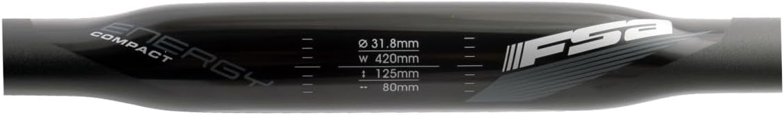 Experience Elevated Control and Style with the FSA Energy Compact SCR Handlebar 31.8 Clamp 42cm Drop 125mm in sleek black aluminum. Crafted from high-strength 7050 aluminum alloy, this road handlebars features innovative engineering through double butting and tapering technology, providing exceptional strength-to-weight ratio at just 269 grams. Its aerodynamic integrated cable routing (ACR) and semi-integrated cable routing (SCR) compatibility streamline your setup for a clean, aerodynamic ride. Designed with a compact bend style and shallow 125mm drop, the Energy Compact handlebar offers a more upright, comfortable riding position ideal for endurance riders and urban cyclists seeking enhanced ergonomics. The 34mm ergo flat top with flattened sections on the tops allows for comfortable hand positioning and accessory mounting, while the 110mm-wide central section accommodates various accessories, including lights or GPS units, for versatile customization. Built for performance and durability, this handlebar features a bead-blasted black finish with polished anodizing accents that resist corrosion and enhance style. Its 31.8mm clamp diameter ensures compatibility with a wide range of road stems, and the 4 outward flare improves control and handling. Whether you're upgrading your road bike for competitive racing or everyday cycling, the FSA Energy Compact SCR Handlebar delivers precision, comfort, and a sleek aesthetic for an outstanding riding experience. Key Features & Benefits: - Materials: Constructed from aerospace-grade 7050 aluminum with double butted and tapered design for optimal strength and weight savings. - Advanced Engineering: Innovative wall thickness manipulation and ergonomic flat top improve comfort and control. - Versatile Compatibility: Supports both integrated (ACR) and semi-integrated (SCR) cable routing for clean installation and optimal aerodynamics. - Optimized Geometry: Compact drop (125mm) and short reach (80mm) suit riders seeking l
