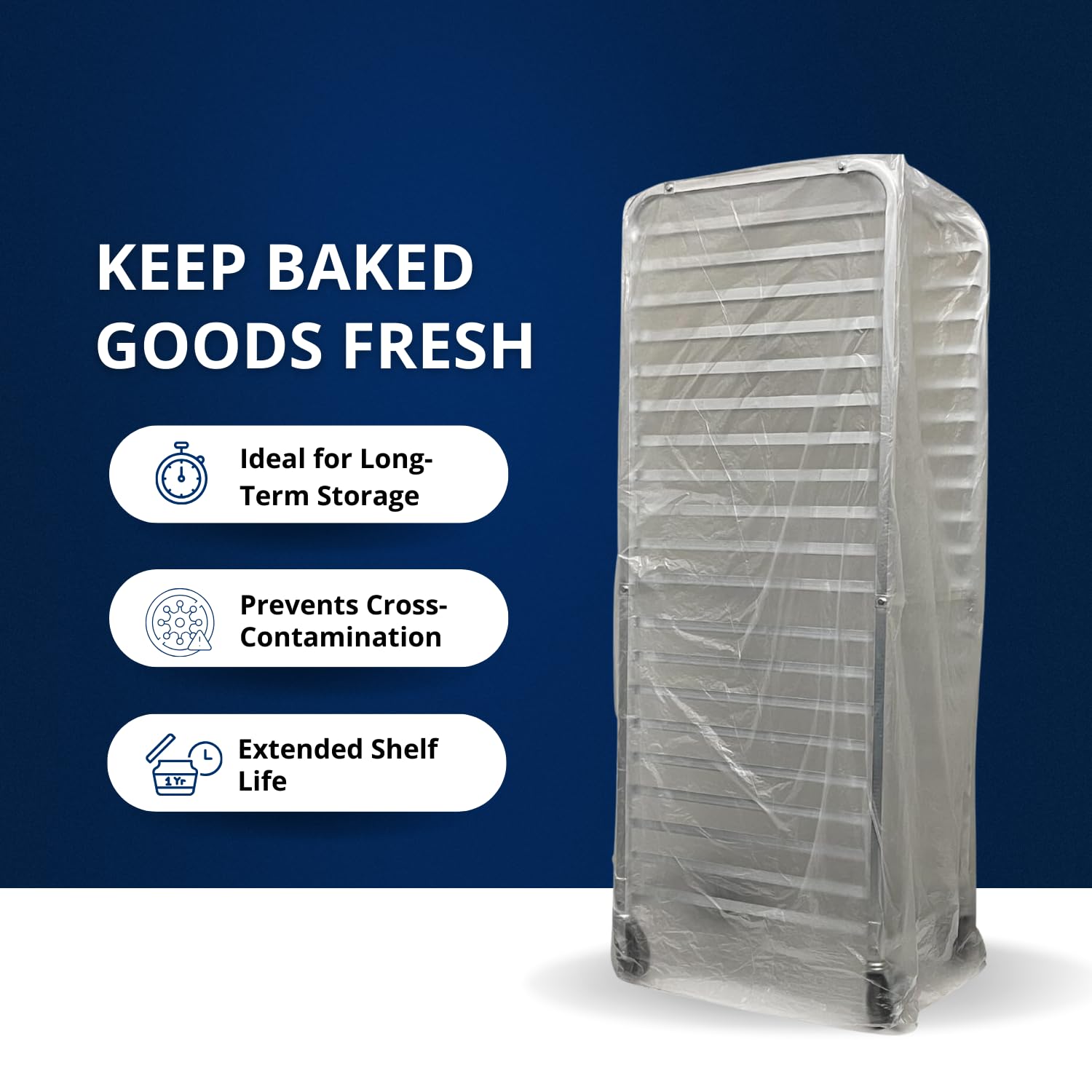 The FSE 630-572 Disposable Pan Rack Covers offer reliable protection for bakeries, restaurants, and commercial kitchens. Designed to cover standard-sized bakery racks, these clear plastic covers measure 20.25 inches wide by 26 inches deep and 69 inches high, making them a perfect fit for most commercial kitchen pan racks and cooling racks for baking. The high-density plastic construction helps prevent contamination while allowing clear visibility of contents for quick identification. Ideal for use with cookie cooling racks, bun pan racks, and bakery equipment, these disposable pan rack covers come in a convenient 50-count case, making them an essential tool in any foodservice operation. Whether you're storing, cooling, or transporting freshly baked goods, these rack covers ensure freshness and cleanliness, while streamlining kitchen organization and workflow. Item Details: Dimensions: 20.25" W x 26" D x 69" H Clear plastic construction Cases of 50