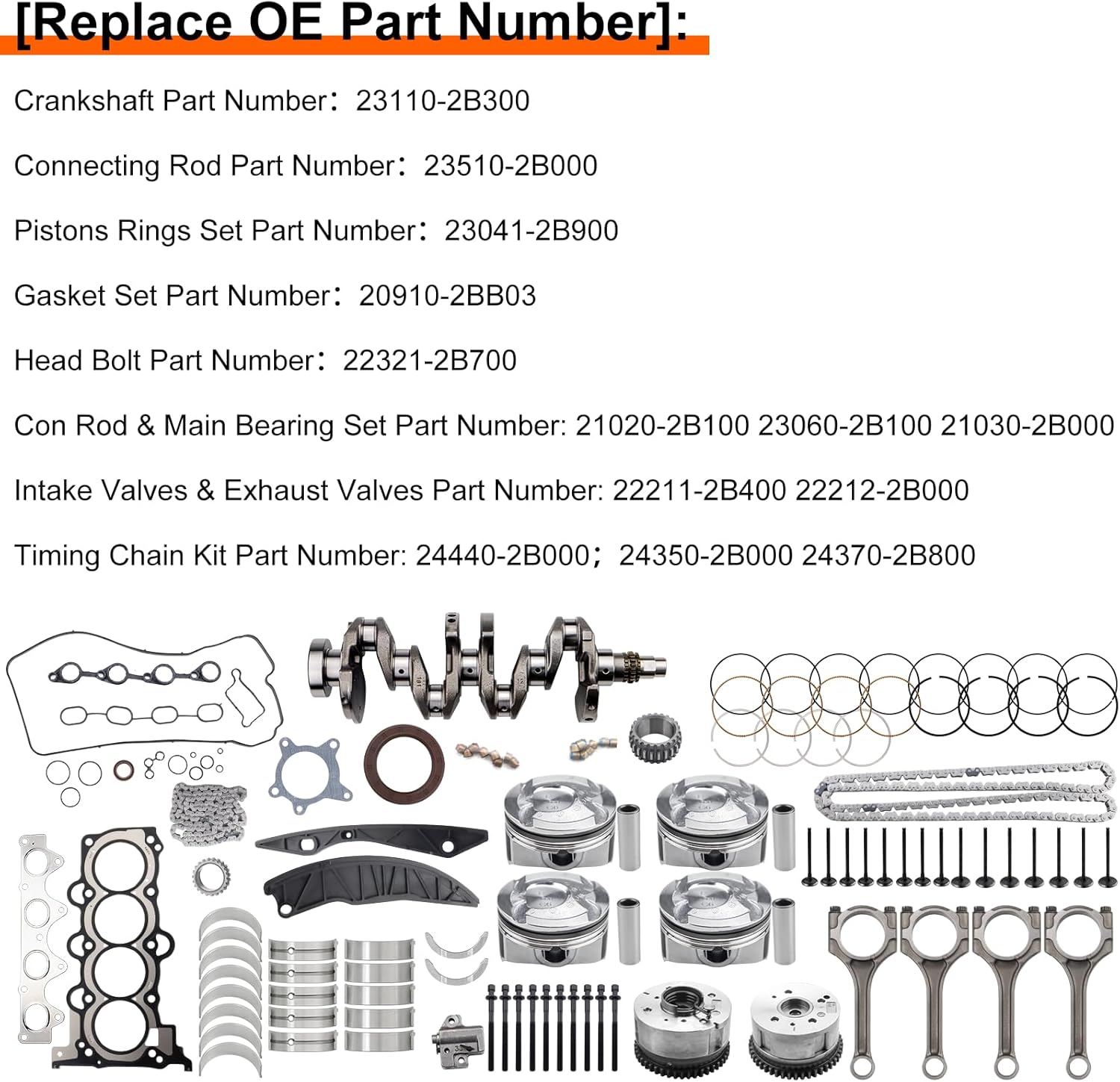 Replace Part Number:Crankshaft OE:23110-2B000, 231102B000601N62BU0023110-2B300, 231102B300Connecting Rods OE:23510-2B000, 23510-2B01023510 2B000, 23510 2B010235102B000, 235102B010Gasket Seal Kit OE:20910-2BJ0120920-2BJ01Pistons & Rings Set OE:23041-2B900, 23041-2B90123041-2B920, 23041-2B91023041-2B921, 23041-2B911Main Bearing OE:21020-2B10021020-2B91121030-2B00021020-2B01021020-2B02021020-2B03021020-2B040Rods Bearing OE:23060-2B10023060-2B00223060-2B01223060-2B02223060-2B03223060-2B042Thrust Washer OE:21030-2B000Head Bolts OE:22321-2B700Intake Exhaust Valve OE:22211-2B00022211-2B400Compatiable With:For G4FG 1.6L Engine Only!!!For 2017-2022 Hyundai Solaris 1.6L G4FG Dual CVVTFor 2010-2020 Hyundai Elantra 5/7 1.6L G4FG Dual CVVT For 2018-2022 Hyundai Venue 1.6L G4FG Dual CVVTFor 2017-2022 Hyundai i30 1.6L G4FG Dual CVVTFor 2017-2022 Hyundai Accent 1.6L G4FG Dual CVVTFor 2015-2022 Hyundai Creta 1.6L G4FG Dual CVVTFor 2012-2022 Hyundai HB20 1.6L G4FG Dual CVVTFor 2012-2017 Hyundai Veloster 1.6L G4FG Dual CVVTFor 2012-2022 Kia Cerato 1.6L G4FG Dual CVVTFor 2014-2019 Kia Soul 1.6L G4FG Dual CVVTFor 2015-2022 Kia Ceed 1.6L G4FG Dual CVVTFor 2017-2022 Kia Rio 1.6L G4FG Dual CVVTFor 2013-2018 Kia ProCeed 2 1.6L G4FG Dual CVVTFor 2022- on Kia Seltos 1.6L G4FG Dual CVVTTiming Chain Kit Components:Timing Chain X 1 PCSCrankshaft Gear x 1 PCSTiming Guide L X 1 PCSTiming Guide R X 1 PCSTiming Chain Tensioner X 1 PCSCVVT Exhaust Camshaft Adjuster Gear X 1 PCS------243702B800CVVT Intake Camshaft Adjuster Gear X 1 PCS -------243502B010All Include Contain:1 Pcs x Crankshaft4 Pcs x Conncting Rods1 Set x Gasket Seals Kit1 Set x Pistons & Rings Kit1 Set x Main & Rod Bearing w/ Thrust Washer8 Pcs x Intake Valve8 Pcs x Exhaust Valve1 Set x Head Bolts1 Set x Timing Chain Kit