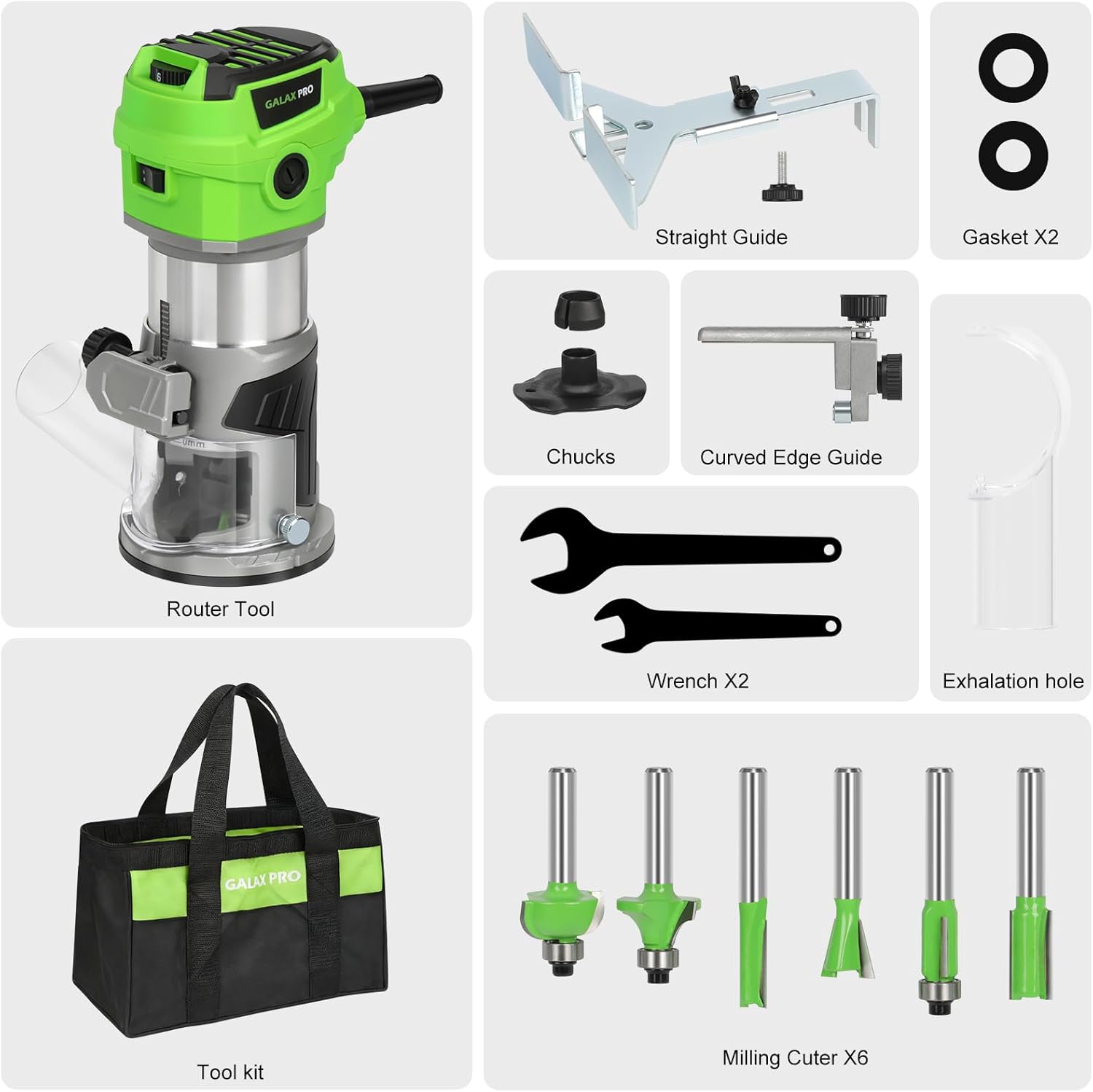 | Included Components | 13mm Wrench, Dust Collection Nozzle, Palm Router, Straight Guide Base, Template Guide |