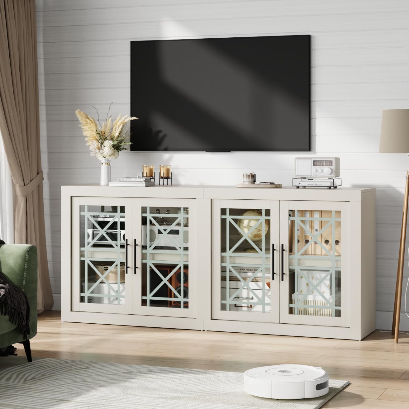 | Storage Options | Visible (Glass Doors), Hidden (Shelves) |