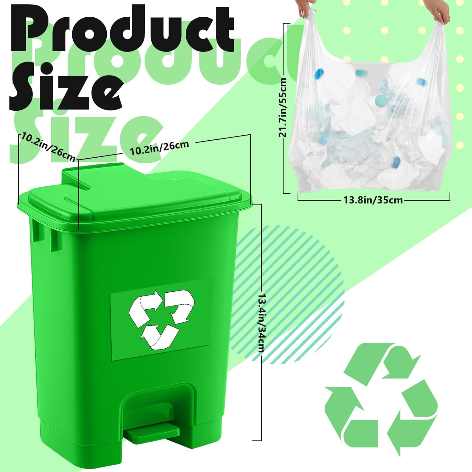 Features: Straightforward application & identification: The recycling waste container's stickers are easy to apply thanks to an adhesive, ensuring quick installation on any recycling waste container. Versatile recycling waste containers: Designed with versatility in mind, our recycle waste container is ideal for various applications, meeting the demands of diverse recycle environments. Specifications: Material: Biohazard trash can: plastic Biohazard bags: polyethylene plastic Color: green Size: Recycling trash can: 13.4 x 10.43 x 10.24 inches / 34 x 26.5 x 26 cm Recycling bags: 10.24 x 16.54 inches / 26 x 42 cm Package includes: 1 X 4 Gallon recycling trash can 2 x Recycling stickers 50 x Recycling bins bags Notes: Manual measurement, please allow slight errors on size. The color may exist a slight difference due to different screen displays