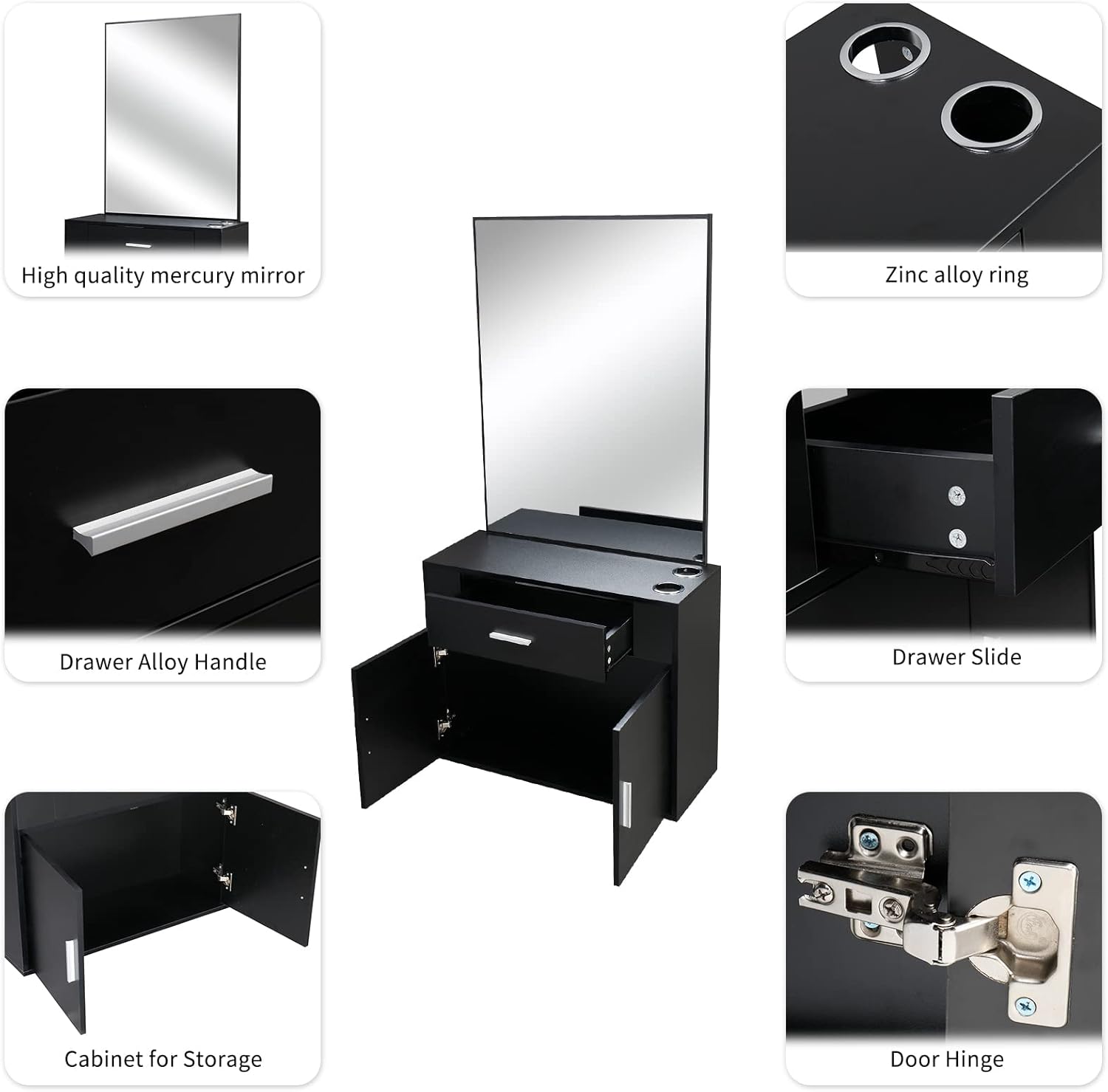 Introductions:This Wall Mount Hair Styling Station will be a great addition to any salon. It is a professional Salon Wall Mounted Shelf Station. There are 1 drawers, 1 big storage at the bottom to present or to store products. With simple design, it is easy to install.It adopts high quality particle board and zinc alloy metal, which is eco-friendly and durable in use. In addition, the salon cabinet is equipped with a mirror, It is full of elegance. What are you waiting for? It is worth buying!Features:1. A professional Salon Wall Mounted shelf station2. Aluminum alloy handle.3. 1 drawer, 1 big storage at the bottom and high quality mercury mirror.4. Easy to install,Note the unit is anchored to the wall for stability. It provides large capacity while effectively making room for other furniture or the aisle in your salon5.The station has cabinet,drawers and Mirror. You can organize your items and decorate your room with your creativity. Once properly installed, the drawer slide smoothly and doors close quietly6. Produced by high quality particle board , eco-friendly and durable in use7. Material upgrade, using zinc alloy metal ring instead of plastic round ring, making the product more durable.8. Full of elegance, modern and fashionSpecifications:1. Material: Particle Board And Zinc Alloy Metal Ring2. Color: Black3. Dimensions: (59.4 x29.6 x 11.8)" / (L x W x H)4.Mirror size:26.8"L x 35.8"H5. Cabinet Dimensions (Inner): 29.6"L x 11.8"W x 16.9"H6. 3 Zinc Alloy Metal Ring Diameter:2.7*2.7"7. Weight: 75 Lbs / 34 KgPackage Includes:1 x Hair Styling Station ( with Mirror)1 x Manual