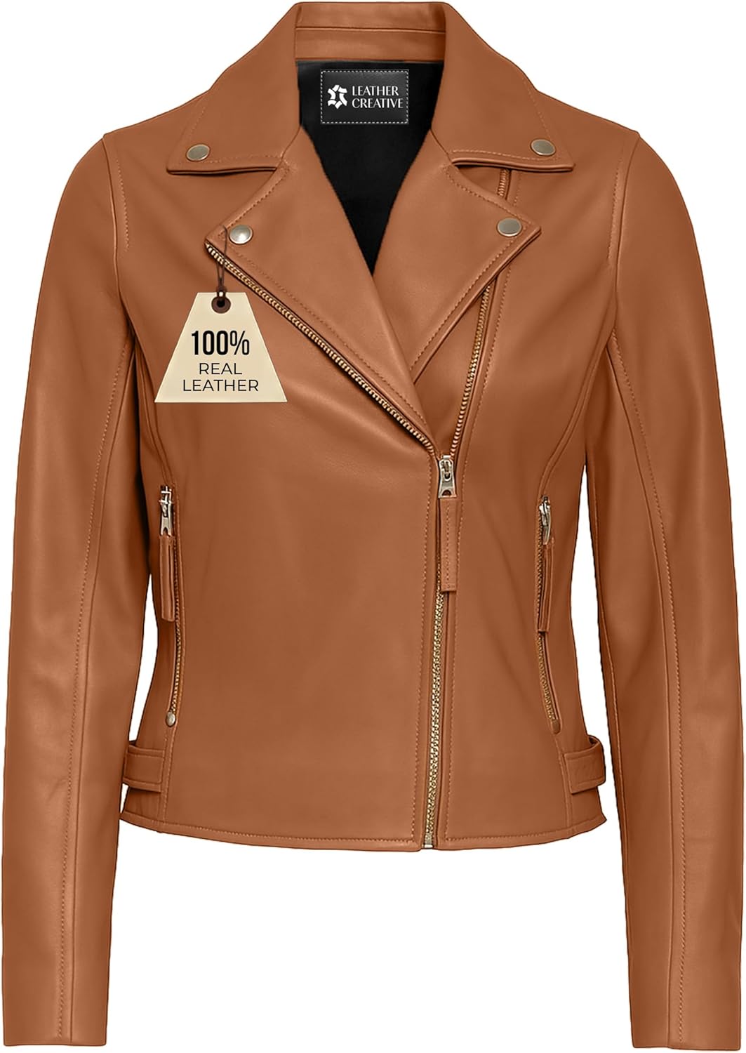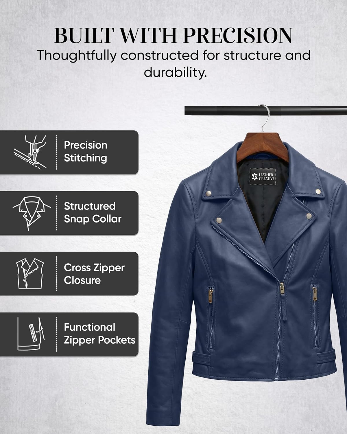The LEATHER CREATIVES Lambskin Leather Cropped Biker Jacket combines bold style and everyday comfort. Made from high-quality lambskin leather with a premium finish, this cropped leather jacket features an oversized, cropped design and a removable waist belt for a customizable fit. With a classic lapel collar, front zipper, and functional zippered pockets, this versatile moto jacket for women is perfect for any occasion. Easy to care for and perfect for pairing with dresses, jeans, or skirts, it’s a stylish addition to any wardrobe.