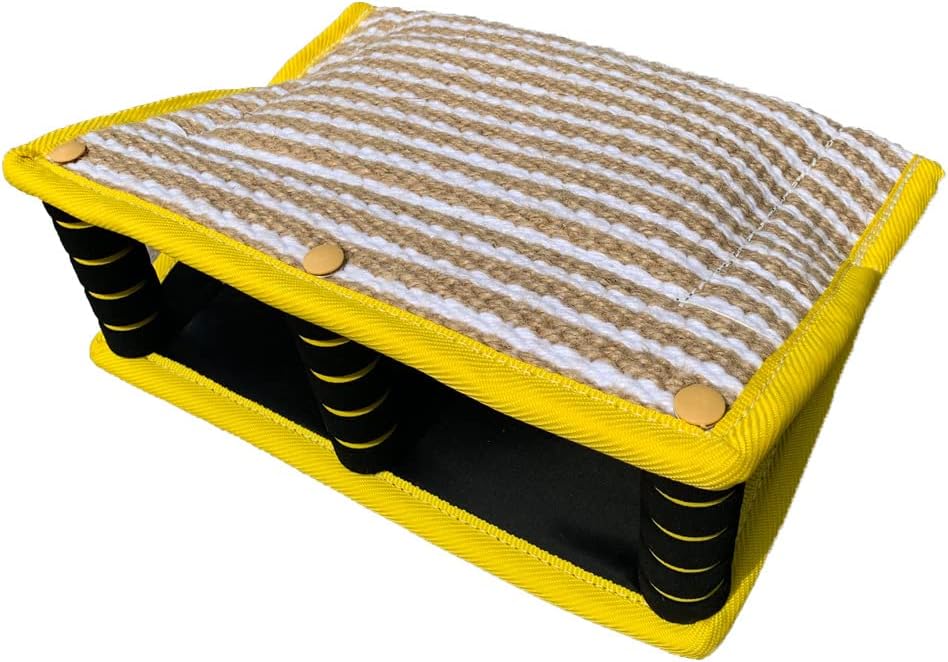 Jute/Linen Dog Bite Wedge Bite Pillow with 3 Handles Tug Training Toy Feature: Material: Quality jute / linen material, well constructed Design: Jute shield and form are stitched together, more sturdy and durable, most important,the biting part is soft no hard frame, which protect dog teeth and bite bone during biting work; Handle design: There are confortabale handles and loop, the handles position are farer from the edge and the biting part than other brand bite wedge, in case of hands get hurt by excited dog's teeth, the loop is perfect working with a pushing leash; Fit for german shepherd, pit bull, belgian malinois, rottweiler, etc. Perfect for IPO, Schutzhund, Ring Sport, Polices K9 and more. Specification: Material: Jute / Linen Size: 350*250*130mm Color: As the picture show Included: 1 x Dog Bite Wedge Pillow