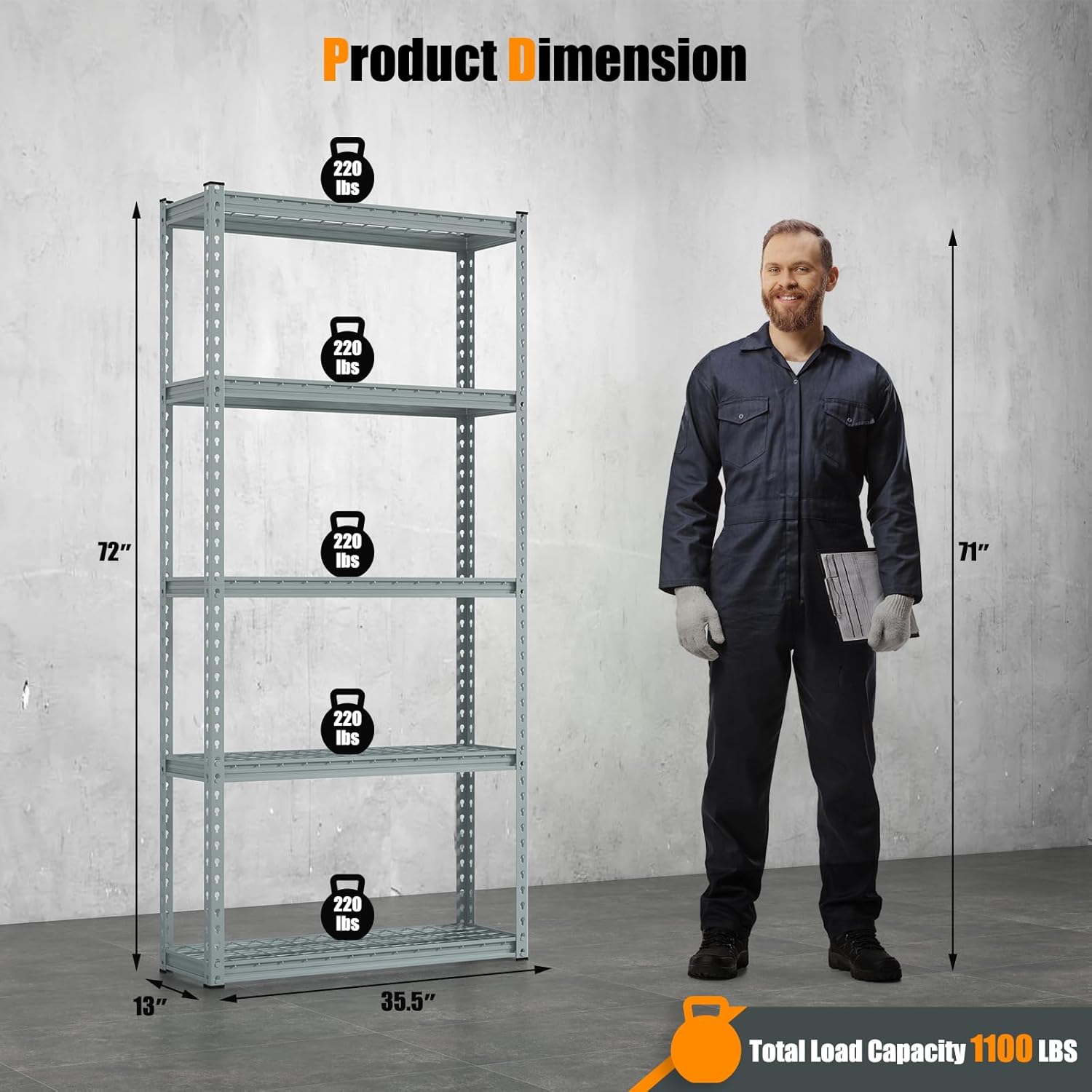 Description: Organize your belongings with ease using our versatile 5-tier large shelf. This spacious storage solution offers ample space for all your storage needs with its multi-layered design and adjustable height options. You can customize the shelf according to your requirements, providing you with flexibility and convenience. Additionally, equipped with anti-slip foot pads and 2 anti-tipping devices, it provides extra stability and prevents any accidental tilting that can support up to 1100LBS of weight. Moreover, crafted with premium and durable materials, this heavy-duty metal wire shelf features a rust-proof metal frame, guaranteeing long-lasting performance even in humid bathroom environments. Installation is a breeze with our simple installation steps, clear installation are included, making the assembly process quick, effortless, and hassle-free. Say goodbye to clutter and embrace the convenience and functionality of our 5-tier large shelf. Experience organized and efficient storage like never before. Features: Multiple storage options for organizing various items Adjustable shelf height for customized storage Versatile and adaptable design for accommodating different-sized items Sturdy construction with anti-tipping feature for extra stability and safety Made of premium and durable materials for long-lasting performance Easy installation process with clear instructions and only a hammer Detachable shelf for ample space to store large boxes Efficient and structured storage solution Specifications: Color: Grey Material: Metal Overall Dimension: 35.5" x 12" x 72" (L x W x H) Load Capacity: 1100 lbs Net Weight: 22 lbs Package includes: 1 x Storage shelf 1 x User Guide
