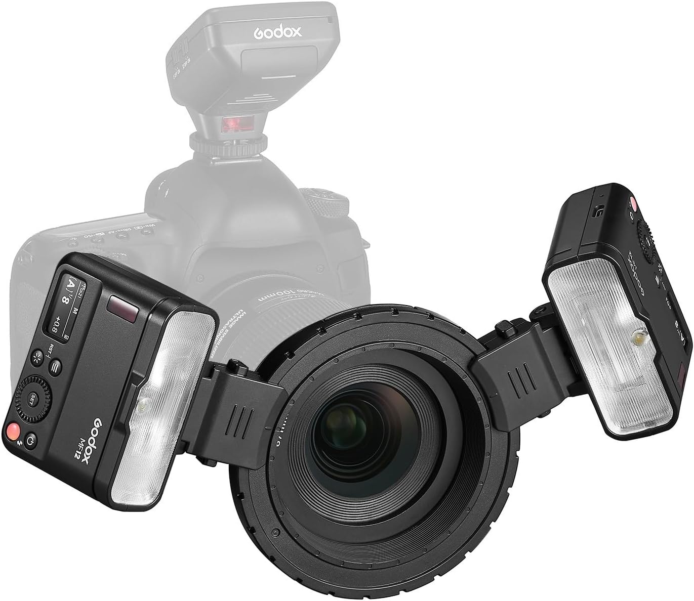 Godox MF12-K2 Tech Speces Built-in Lithium Battery: 3.7V/1700mAh Guide No. (1/1output): GN=16.1(±0.1) Flash Power: 12W Output Level: 8 levels: 1/128~1/1 Brightness of LED Modeling Lamp: 1~10 Levels Display: OLED Display Optical Flash S1 Secondary Optic Triggering s2 Secondary Optic Triggering with Anti-preflash Flash Mode: TTL Autoflash, M manual flash Flash Duration: 1/1200s~1/34000s 2.4G Wireless Transmission: ON/OFF Channel: 32 channel: 1~32 Group: 5 group: A/B/C/D/E ID: OFF/01~99 Transmission Distance: 30m Type-C Power Charging: 5V 2A Full Power Flashes: Approx.500 Recycle Time: Approx.0.01~1.7s Battery Level lndication: Battery level indicator shows on the upper right corner of the displayPackage Including: 2x Godox MF12 2x Flash Stand 2x Cold Shoe Adapter 1x Carry Case CB31 2x Color Filter Holder 2x Color Effects Set MF-11C 2x Extreme Close-Up Positioning Adapter 1x Mounting Ring MF-AR 2x Color Temperature Adjustment Set MF-11T 2x Type-C USB Cable 1x Adapter Rings Kit AR-R ki 1x HolaFoto Cloth