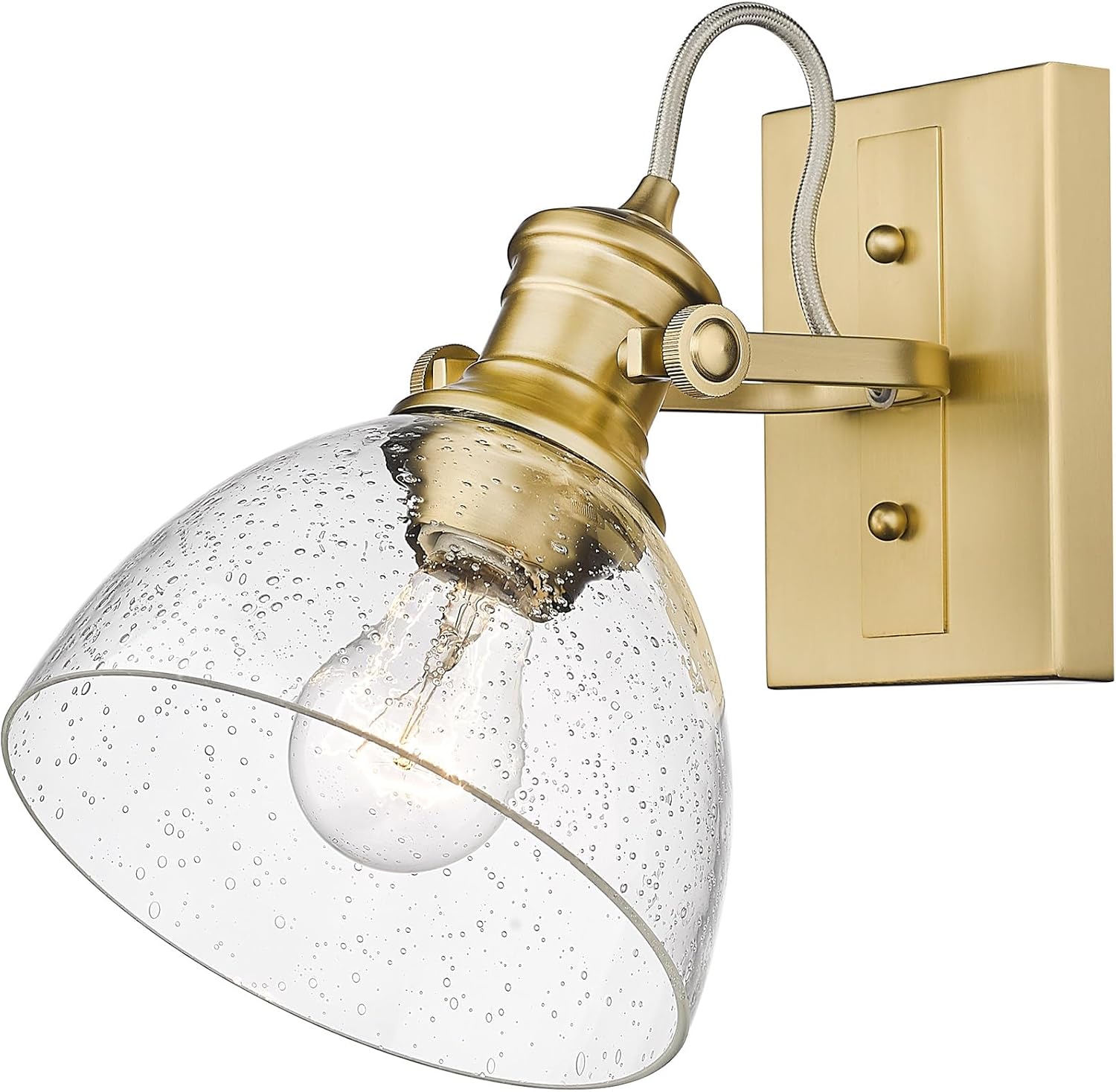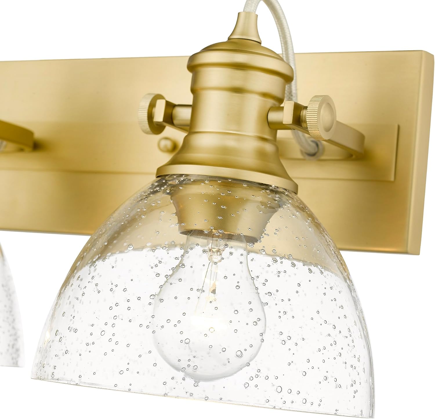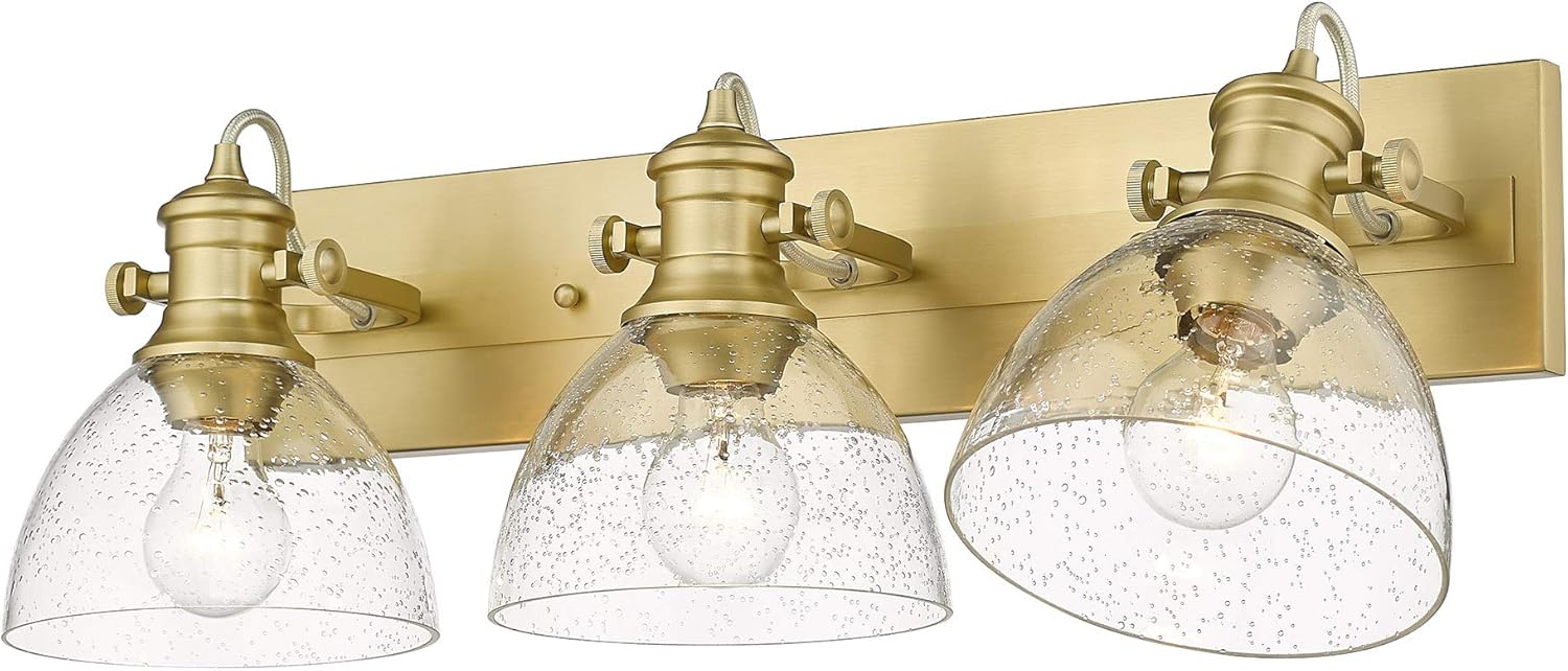 The inspiring, romantic fare of village nautical charm recreates a stunning vision in this modern three-bath light, a great way to frame a custom vanity in a contemporary bath space. From the Hines collection by Golden Lighting, this vanity light adds maritime personality with an old industrial feel, embellished with a lovely brushed champagne bronze finish steel frame and wall mount. Heady, shapely shades formed of seeded glass add to an authentic nautical theme.