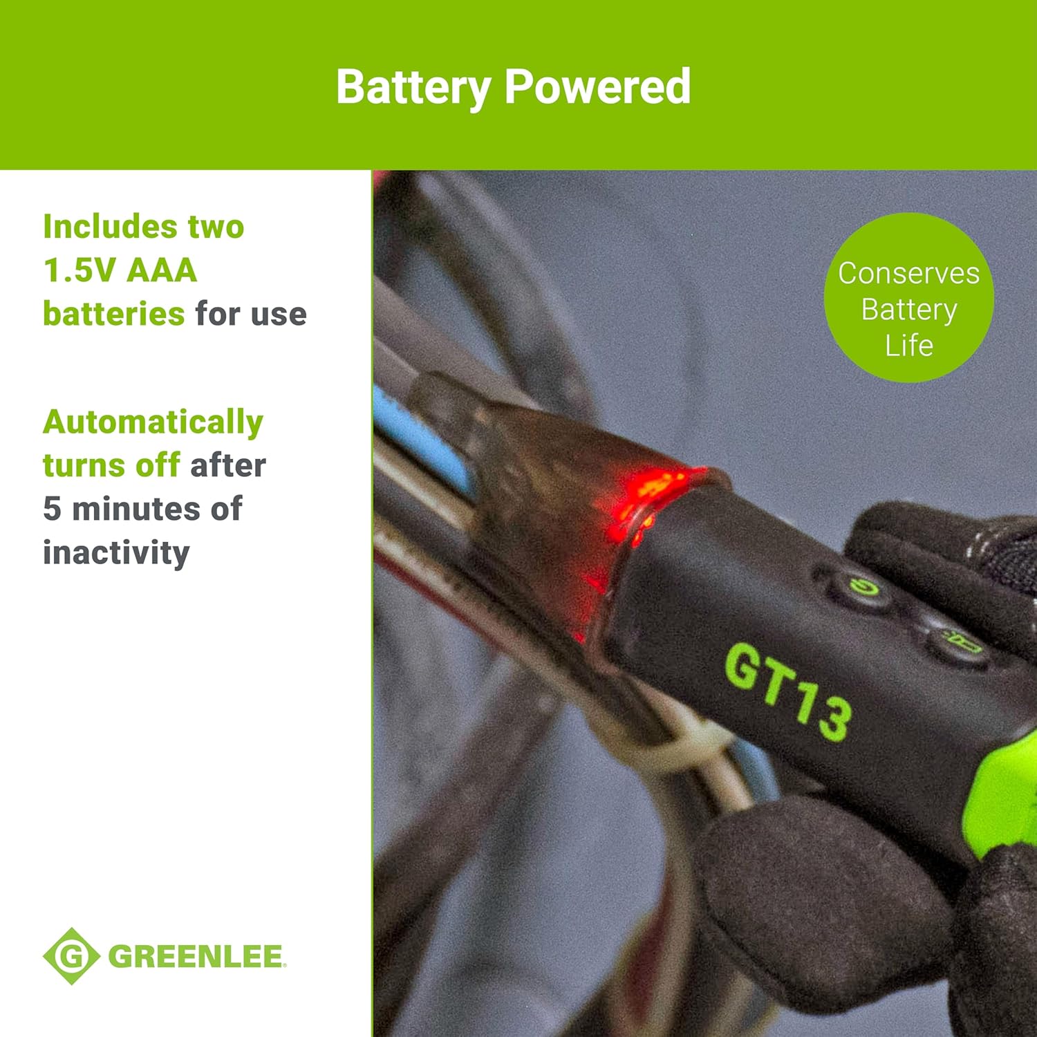 Master your jobs with advanced technology and accuracy with the Greenlee GT13 Non-Contact Voltage Detector (catalog number GT13). A favorite of electrical experts, this innovative voltage detector pen tests and accurately detects voltage in outlets, lighting fixtures, power wiring, cables, and circuit breakers with audible and visual alerts. The non-contact voltage tester's design allows you to safely detect AC voltage from 50V to 1000V AC, and it has a frequency rating of 50/60Hz. With innovative technology, its patented automatic self-test verifies circuit integrity for maximum convenience and efficiency on the job. When working in dark areas, this voltage locator tool features a bright flashlight to help you see better during receptacle testing. Powered by battery, this low-voltage circuit detector includes two 1.5V AAA batteries for use and automatically turns off after 5 minutes of inactivity to conserve battery life.Greenlee: Professional. Nothing Less.™