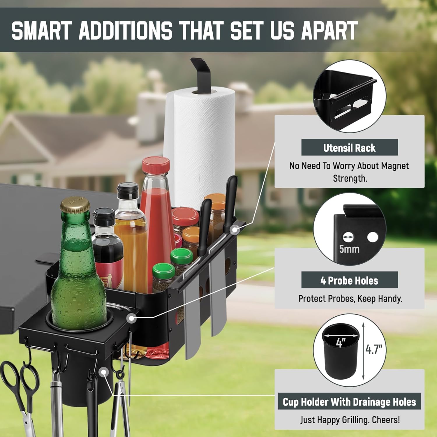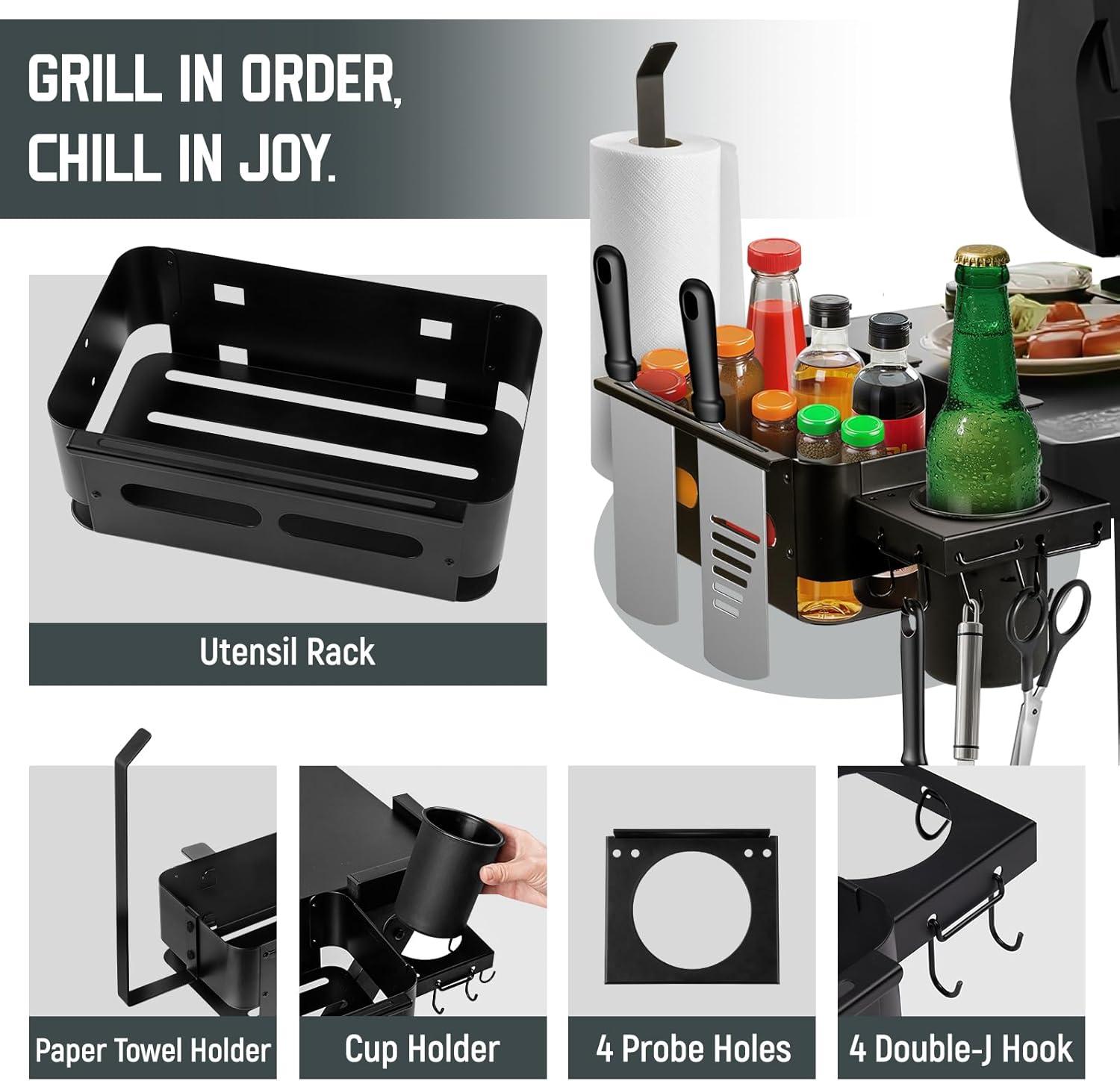 | Included Components | Cup Holder, Probe Holes, Utensil Rack, Paper Towel Holder, Hooks |
