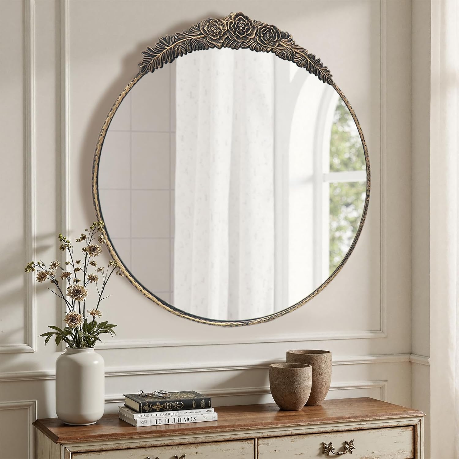 Transform your home with the timeless elegance of this Vintage Round Gold/Black Wall Mirror. Designed with an intricate floral crown detail and a beautifully textured golden frame, this mirror combines classic charm with functional design. The high-definition glass delivers a crisp, clear reflection, making it perfect for everyday use while doubling as a stunning decorative accent. Measuring 24/28 inches, it’s the ideal size for creating a focal point in your living room, bedroom, hallway, or bathroom vanity. Built with a sturdy frame for durability and equipped with pre-installed hanging hardware, this mirror is easy to mount and designed to last. Whether you’re looking to brighten up a small space, add depth to a room, or simply elevate your interior décor, this round floral mirror is the perfect choice for bringing elegance and warmth to your home.