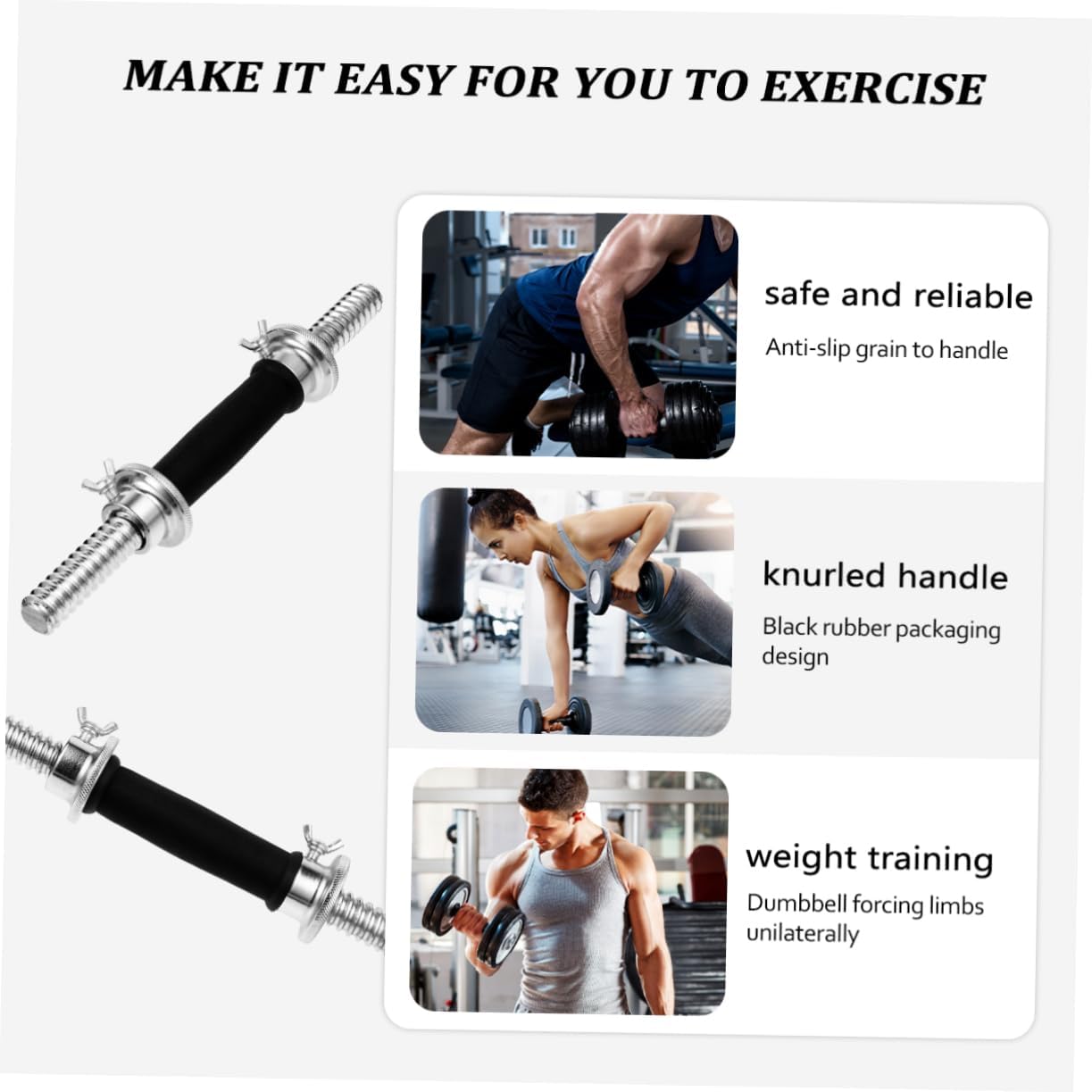 Package List 1 x dumbbell bar Features - Material: Steel Barbell Handle. - Size: 35.00x7.00x6.00cm/13.76x2.75x2.36inch Dumbbell Straight Bar. - Color: Black and sliver Weight Lifting Training Dumbbell Bar. - Dumbbells force limbs to work unilaterally. Over-compensation is impossible with dumbbells, making them an eliminate strength imbalances Dumbbell Connecting Rod. - The rubber-coated dumbbell bar is equipped with a steel double safety nut, which can further fix the dumbbell piece and prevent the nut from loosening, and is safer to use Dumbbell Bar for Weight Lifting. - Made of , its anti-skid dotted grain handle offers when exercising, which can ensure your safety Electroplating Dumbbell Bar. - It is an assembly accessory for gym and home exercise, giving you a hassle- workout experience Weightlifting Equipment Rod. - The black rubber encapsulation design greatly increases the friction and makes it feel in use Barbell Replacement Rod.Goods InformationDumbbell Straight Bar Want to do workouts training but the gym VIP costs too much? Well, this pair of dumbbell handles can help you do weight lifting training at home.Weight Lifting Training Dumbbell Bar Made of steel, the dumbbell handles are hardy duty, knurled handle prevents