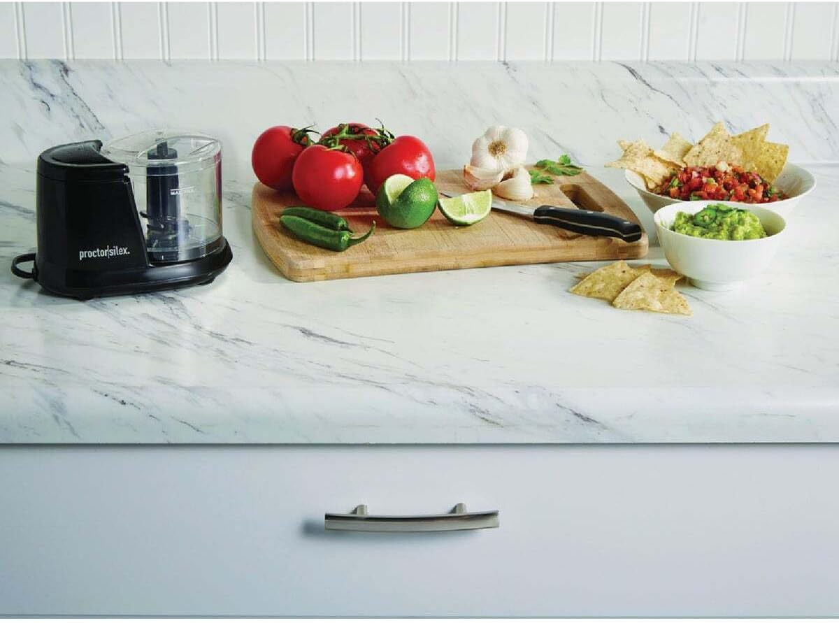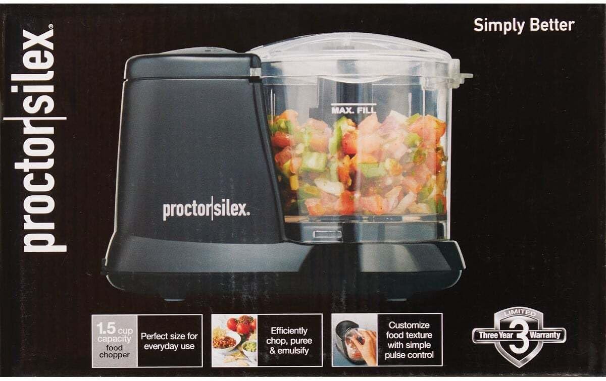 1.5 cup mini food chopper black. This chopper reduces prep time in the kitchen and the pulse function offers exceptional control over consistency.; ; Brand Name: Proctor Silex Finish: Matte Color: Black Capacity: 1.5 cups Product Type: Food Chopper Watts: 80 W Number of Speeds: 2 speed Locking Lid: Yes Dishwasher Safe Parts: Yes Work Bowl Material: Plastic Blade Material: Stainless Steel Base Material: Plastic Pulse Control: Yes