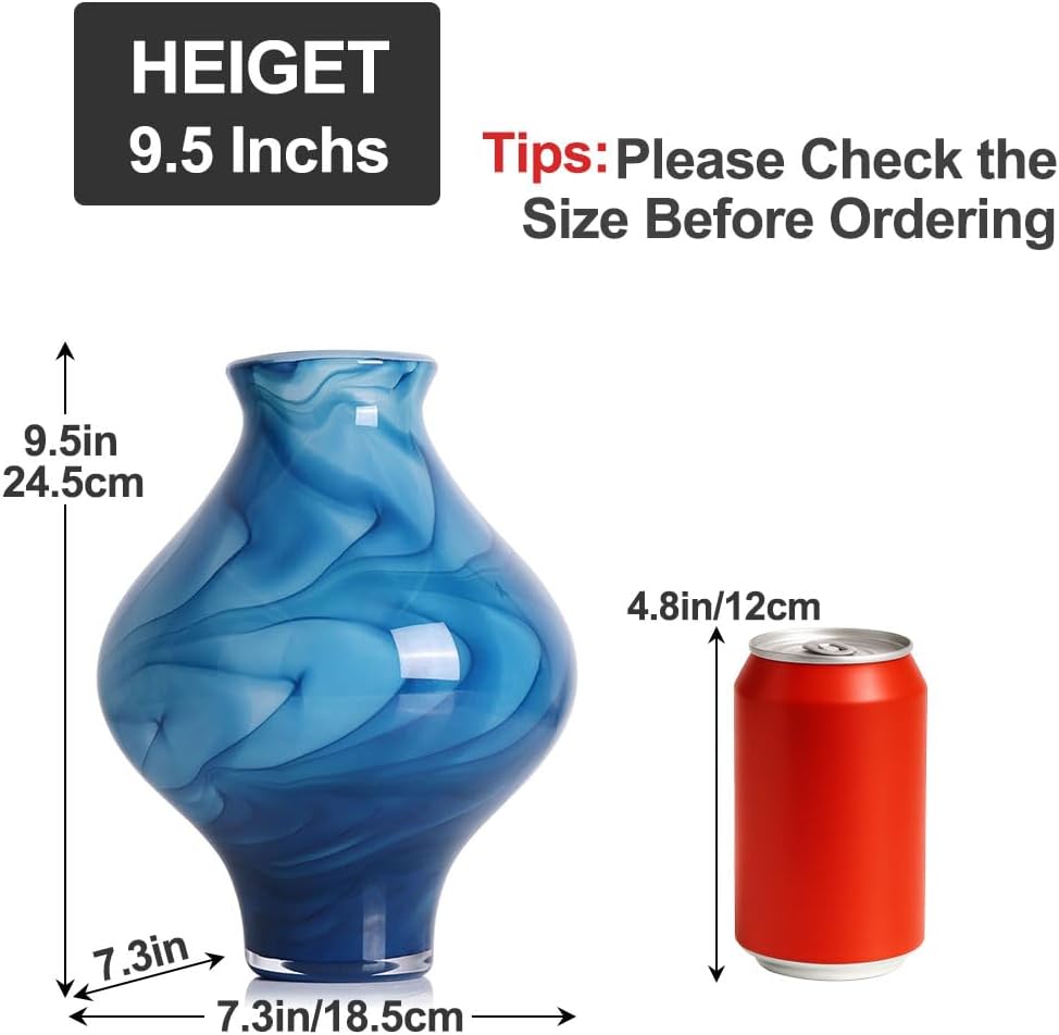This beautiful blown glass vase combines modern design with artistic craftsmanship. Standing at 9.5 inches tall with a 7.3-inch length and width, this blue glass vase is perfect for showcasing flowers or as a statement piece. The 3-inch bottle opening makes it ideal for hand blown glass flowers, pampas grass, or dried botanicals, adding a vibrant touch to any room. Crafted from hand blown glass, this decorative glass vase features a stunning blend of colors, offering a unique and sophisticated look. Its smooth finish and striking design make it a perfect addition to any modern glass vases collection. Whether as a blown glass centerpiece or an accent piece on a shelf, this large blue glass vase complements both coastal and modern decor styles. Inspired by Murano glass decor, its elegant design and flawless finish create a captivating focal point in living rooms, offices, or bedrooms. This unique glass vase brings artistic flair, making it perfect for those who appreciate fine craftsmanship. As a flower vase glass, it provides functionality and beauty in one piece. Its versatile design allows it to be used as a blue glass vase in various settings, such as bathroom decor or as part of your dining room arrangement. The sturdy construction ensures it remains a timeless addition to your space. Perfect for gifting, this hand blown glass vase adds elegance to birthdays, weddings, housewarmings, or anniversaries. Elevate your space with this beautiful, blown glass decor piece that suits any occasion or decor style.